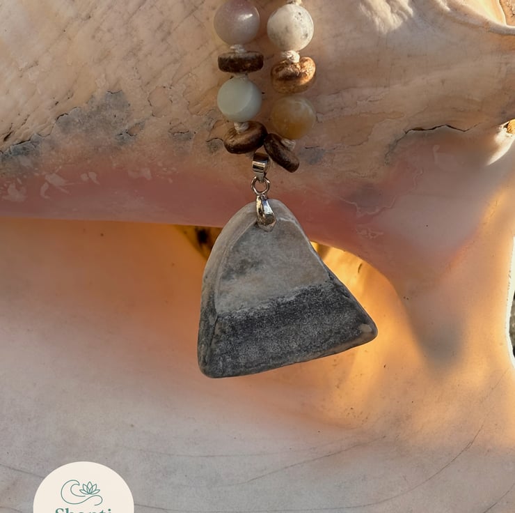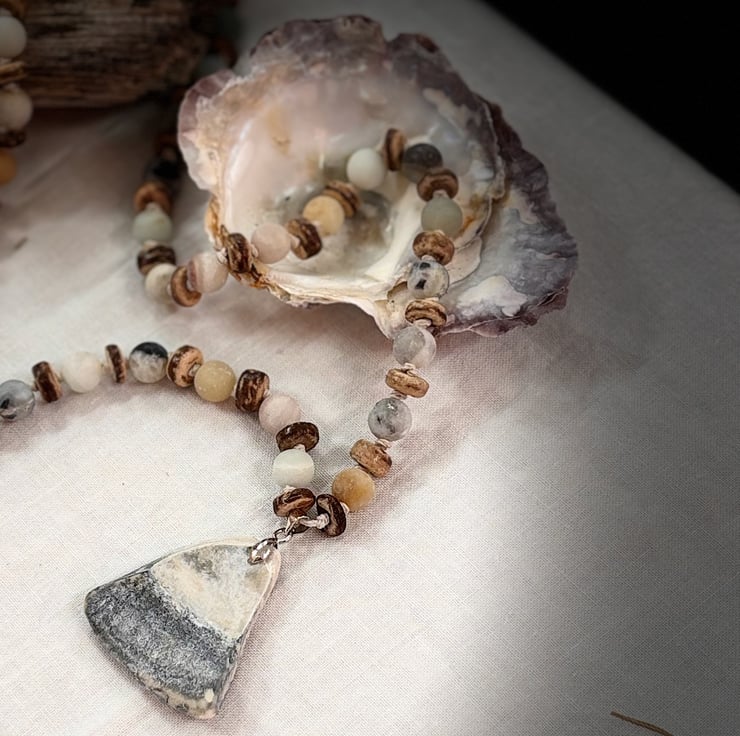 One of my favourite pieces. Amazonite beads are frosted, separated by coconut slices and hand knotted with hemp thread between each. The shell is robust and has beautiful shades of grey/blue/white creating a lovely coastal picture. The shell is as found and unaltered mounted. Lobster clasp and extender chain in silver coloured metal. At shortest length is 60cms and at longest approx 65cms. Absolutely unique, never to be recreated or copied.