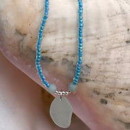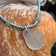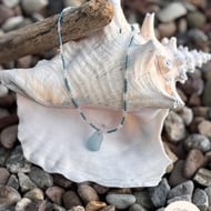 One of my favourite pieces. Amazonite beads are frosted, separated by coconut slices and hand knotted with hemp thread between each. The shell is robust and has beautiful shades of grey/blue/white creating a lovely coastal picture. The shell is as found and unaltered mounted. Lobster clasp and extender chain in silver coloured metal. At shortest length is 60cms and at longest approx 65cms. Absolutely unique, never to be recreated or copied.
