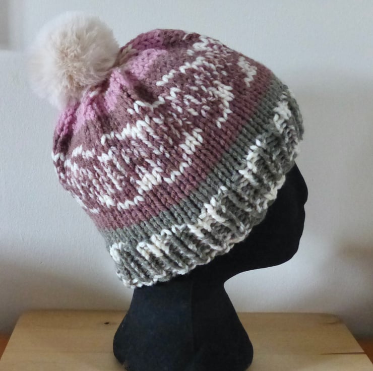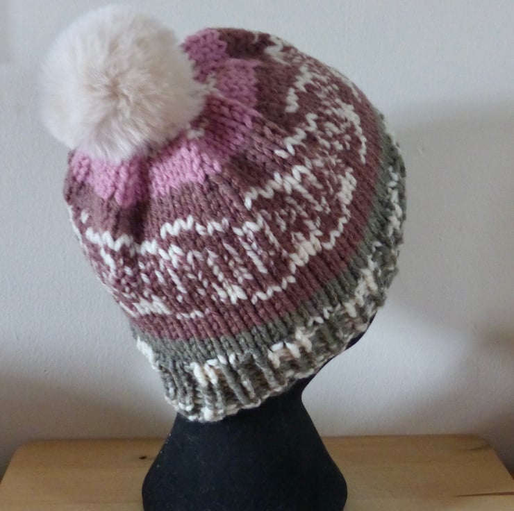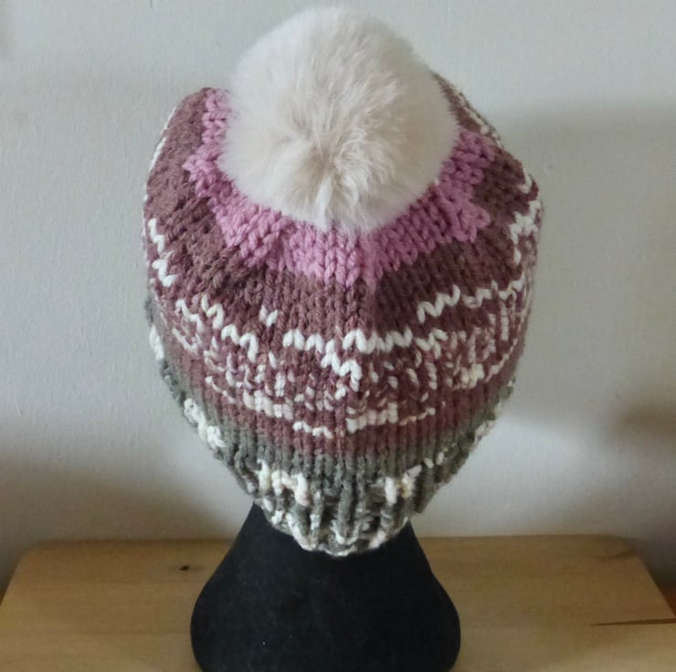 A hand knitted Beanie Hat in a chunky self patterning yarn which gives a 'fairisle' effect. It is 80% Acrylic and 20% Merino Wool so is lovely and soft. The colours are Brown, Light Burgundy, Pink and Off White and it is topped with a fluffy off white pompon.
