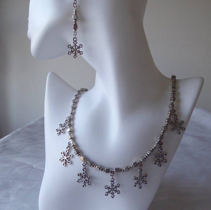Metal Cube and Rondelle Beaded Necklace with Seven Dangling Snowflakes