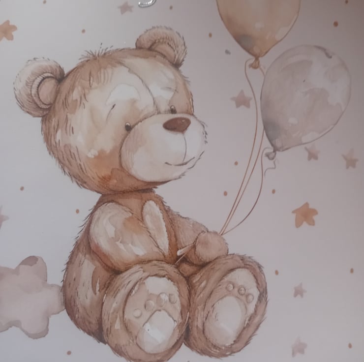 A cute bear with balloons with a star background has a greeting for the new baby girl. made with care to greet a very special occasion. has an envelope and is wrapped