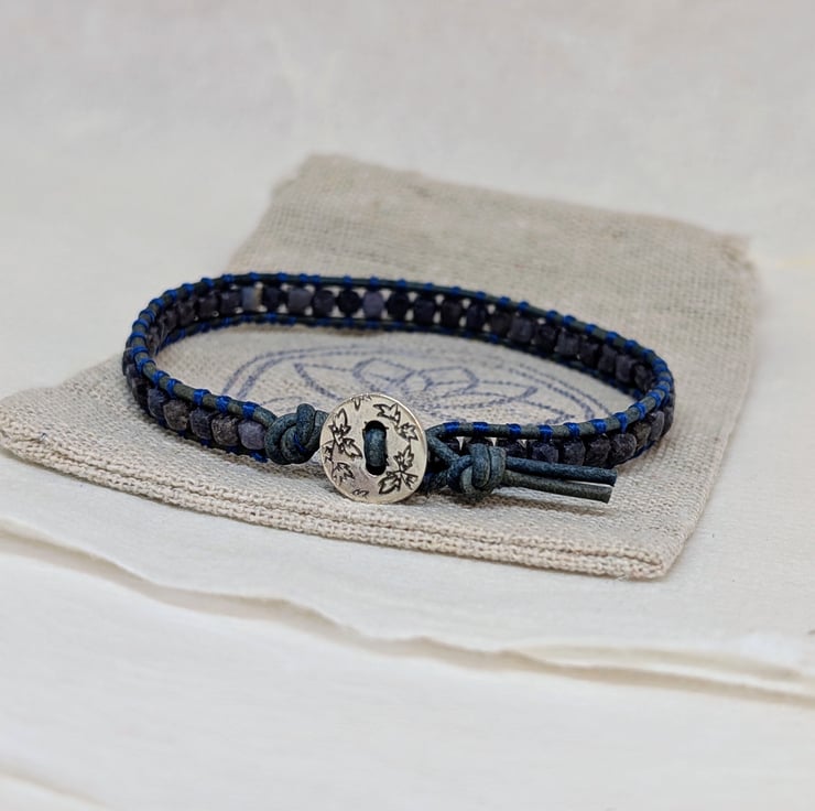 This understated bracelet features tiny sapphires attached to blue leather cord, with a silver coloured button being used as a fastener. The navy gemstones are faceted which means they'll really catch the light when you wear it.