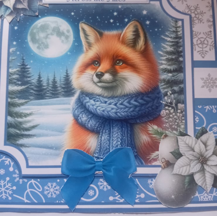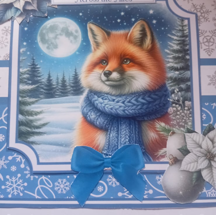 a lovely large 8 x 8 inch card with a lovely fox with a warm woolly scarf on. Underneath the fox is a faux bow, plus the frame around the fox is a multi-blue and white frame with poinsettias baubles and snowflakes. has a greeting of across the miles. with an envelope and wrapped