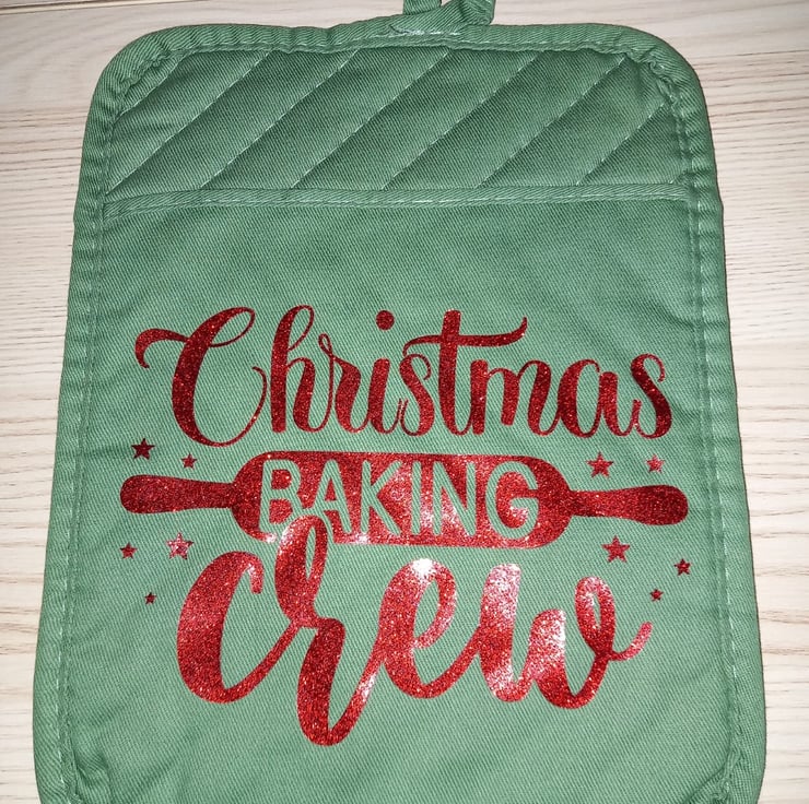 A handmade 100% cotton green pot holder, featuring a red glittery design "Christmas Baking Crew" in Heat Transfer Vinyl.