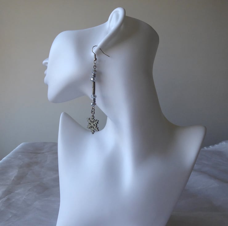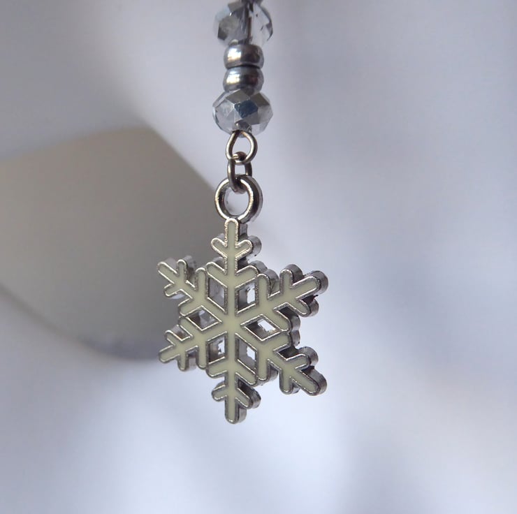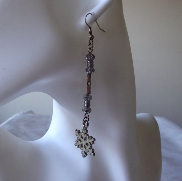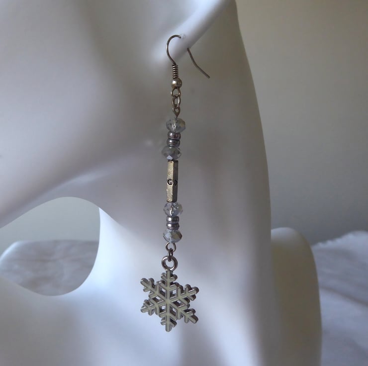 Pair of Long Dangly Enamelled Snowflake Earrings with Faceted Glass and Metal beads
