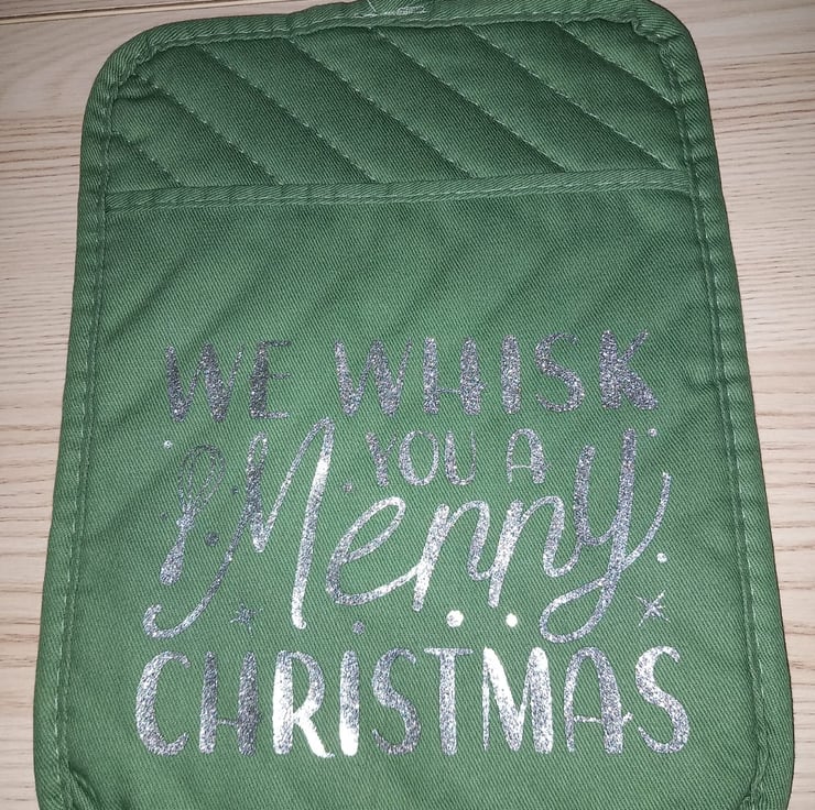 A green 100% cotton pott holder oven mitt featuring a silver sparkly design in Heat Transfer Vinyl saying "We whisk you a Merry Christmas".