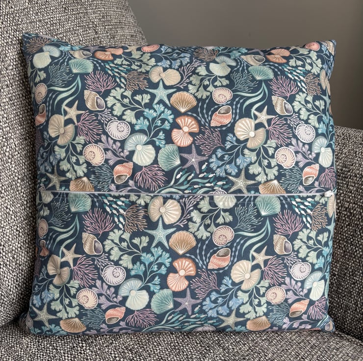 The cushion front is quilted with a layer of natural wadding for extra comfort. The backing fabric is the same Ocean Pearls fabric and has a zip for easy access.