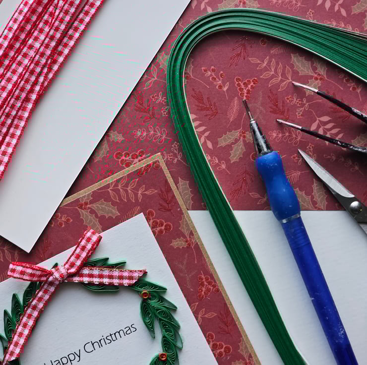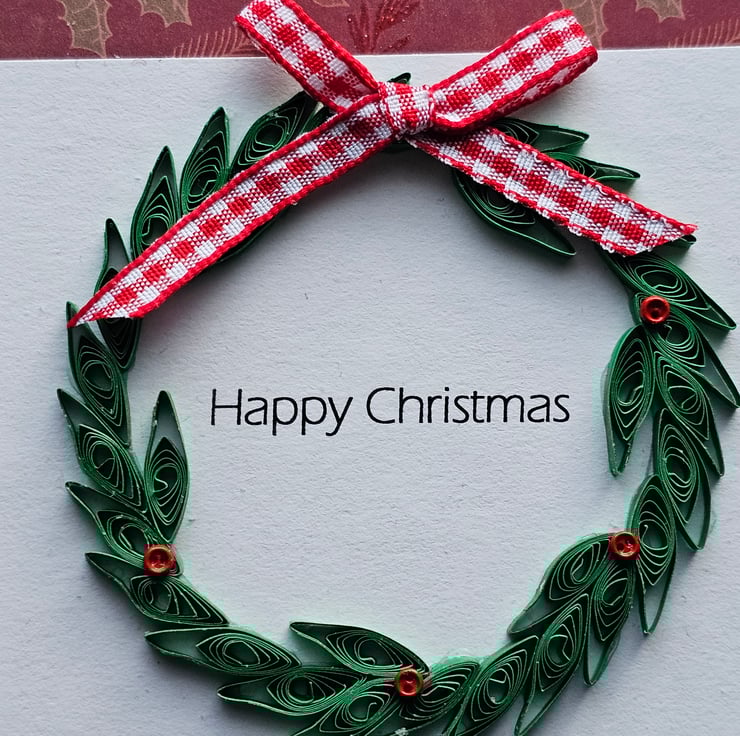The card is made using a folded brown kraft card lined with red patterned paper, strips of dark green quilling paper, tiny red buttons and red and white gingham ribbon. The greeting is printed on quality paper.