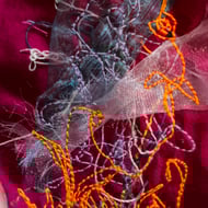 Mini pink & grey free-motion embroidery collage made with satin, organza & patterned polyester lining. Approx. 6cm x 5cm.
