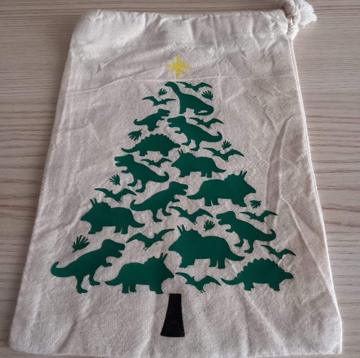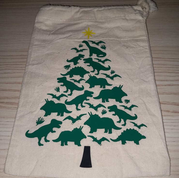 A cotton drawstring bag measuring 13 x 19 cm, featuring a design of green dinosaurs in the shape of a Christmas Tree. A Christmas treat bag for kids to keep trinkets, receive small gifts in, or hold Christmas chocolate and sweets!