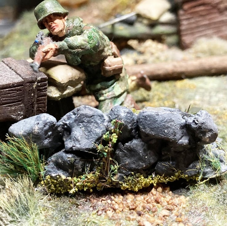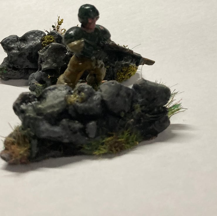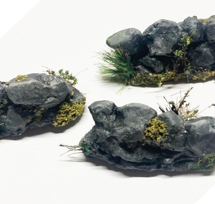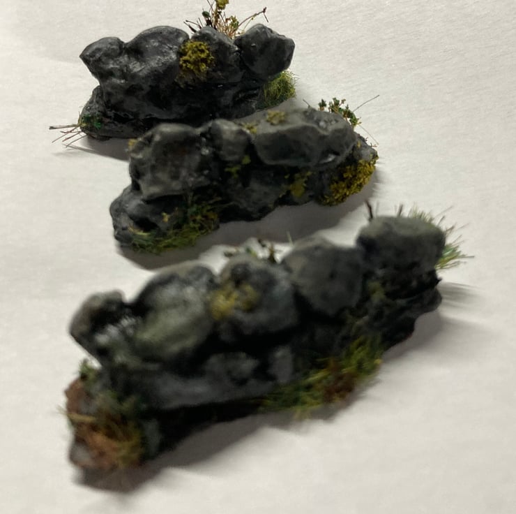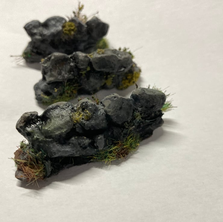 Handmade war gaming scenery using modelling plaster and moulds.. Three sections of drystone wall for modelling, dioramas and also scenery for table-top games. I have painted (including highlighting and wash) and added flock, but the models can still be edited. Perhaps if used for wargaming scenery you may want to add more of a base. Size is around 17mm top to bottom.. which fits well with 28mm models.. but also can be used as smaller sections of wall right up to 1/35.