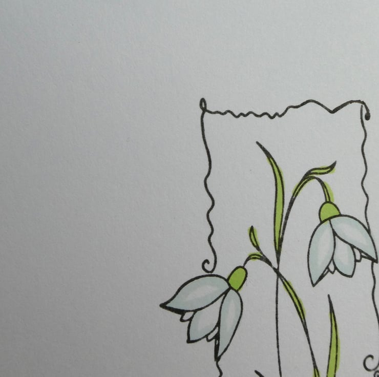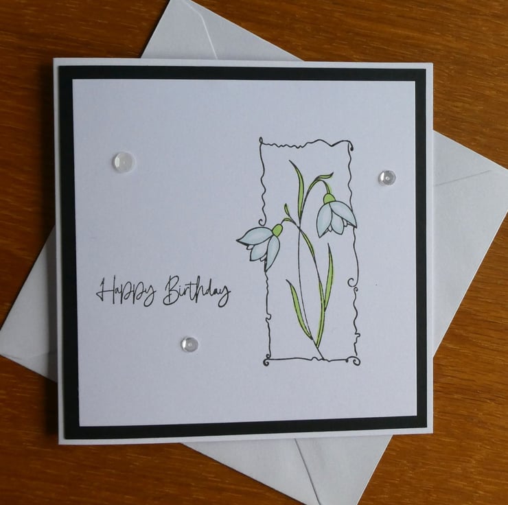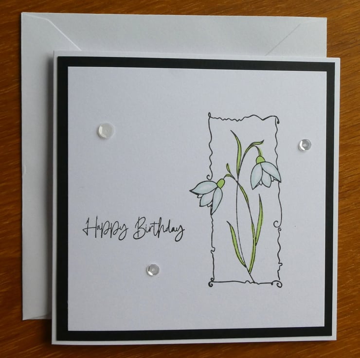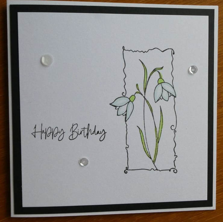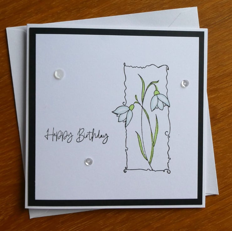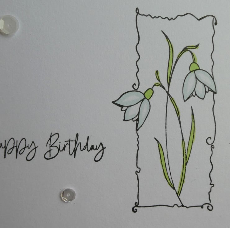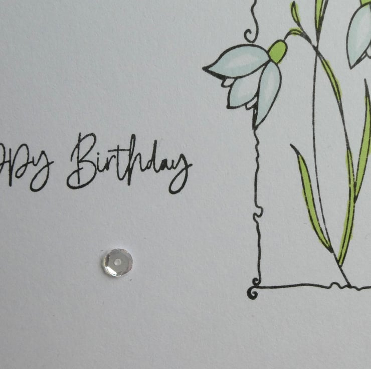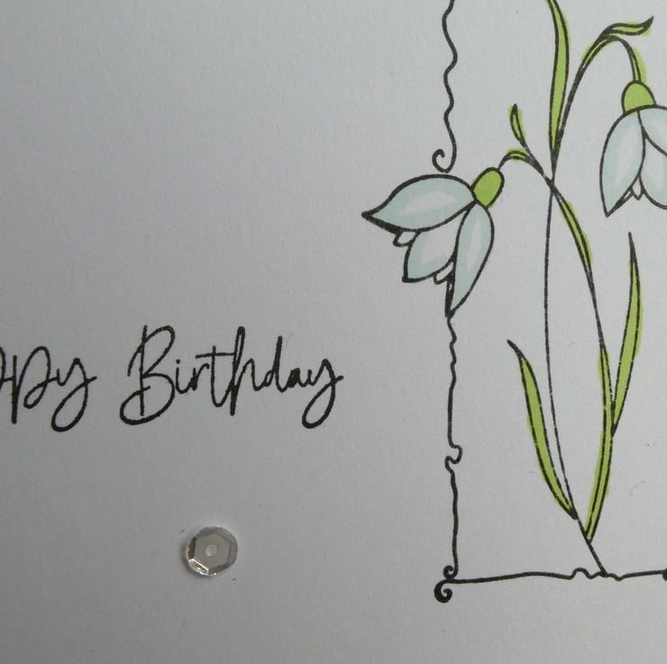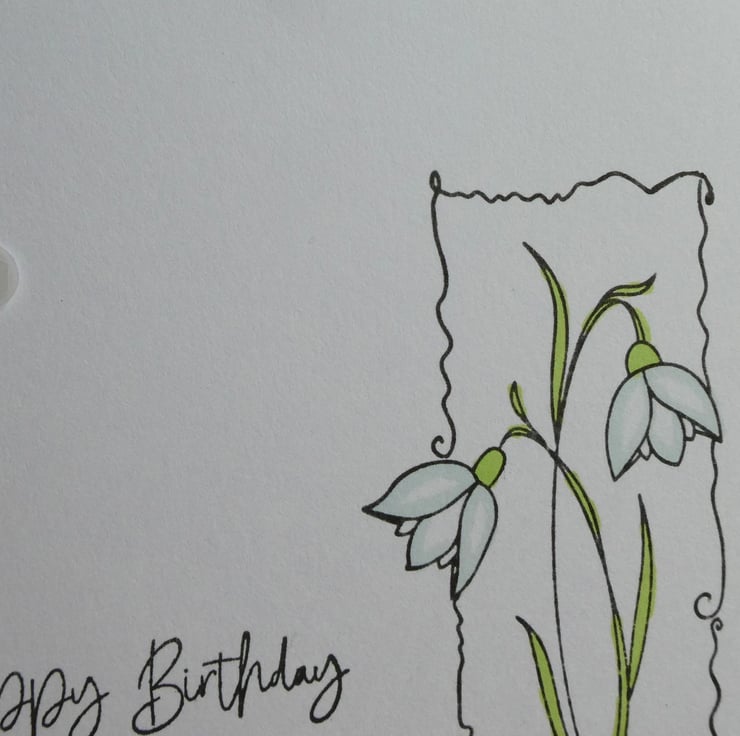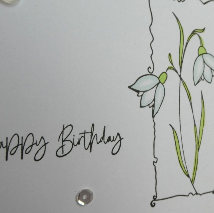 With the message Happy Birthday this card has an image of delicate snowdrops hand stamped and coloured on a base of white card in a clean and simple design. Ideal for a winter or spring birthday or for someone for whom snowdrops are a favourite.