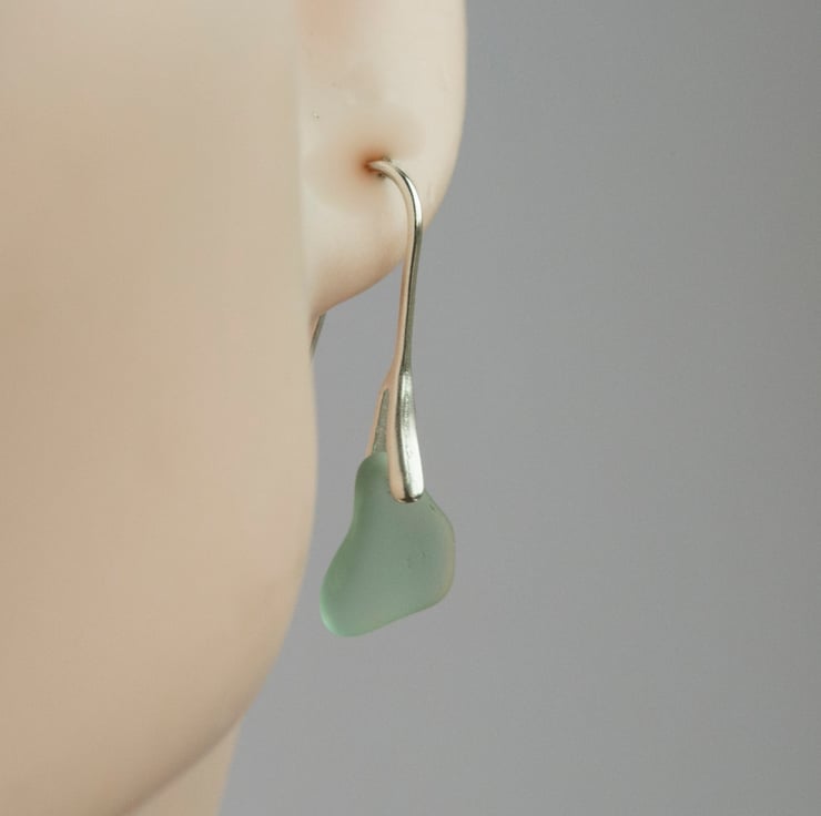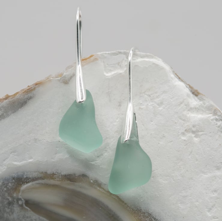 Rare turquoise sea glass earrings with long stemmed sterling silver plated hooks. Each earring measures 3 cm in total (length from the ear piercing to the end of the sea glass piece) with the sea glass piece itself measuring 1 cm in length. The sea glass has a naturally tumbled shape, and was found on Brighton & Hove & South Cornwall beaches. Arrives in a gift bag with card.