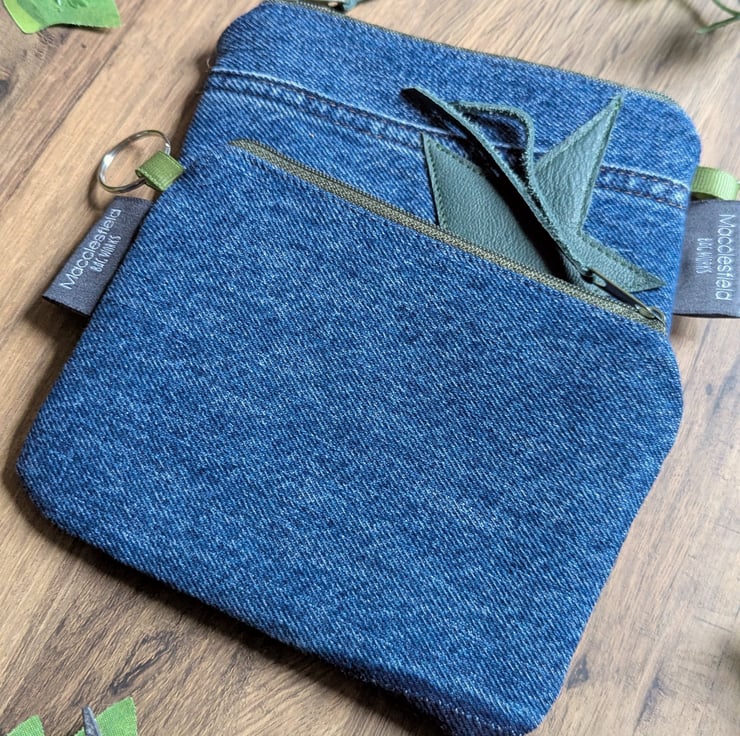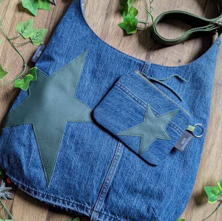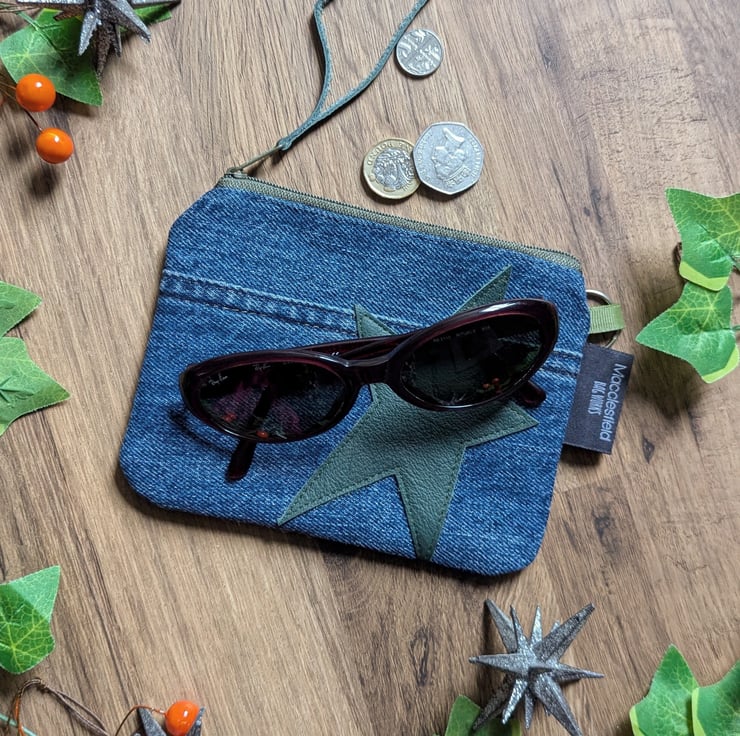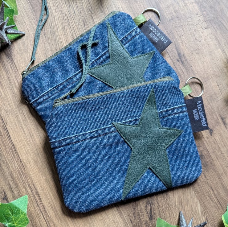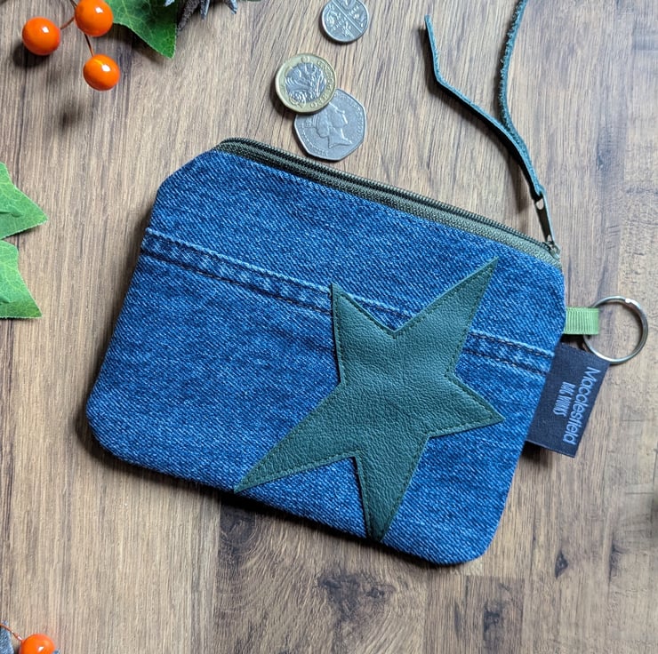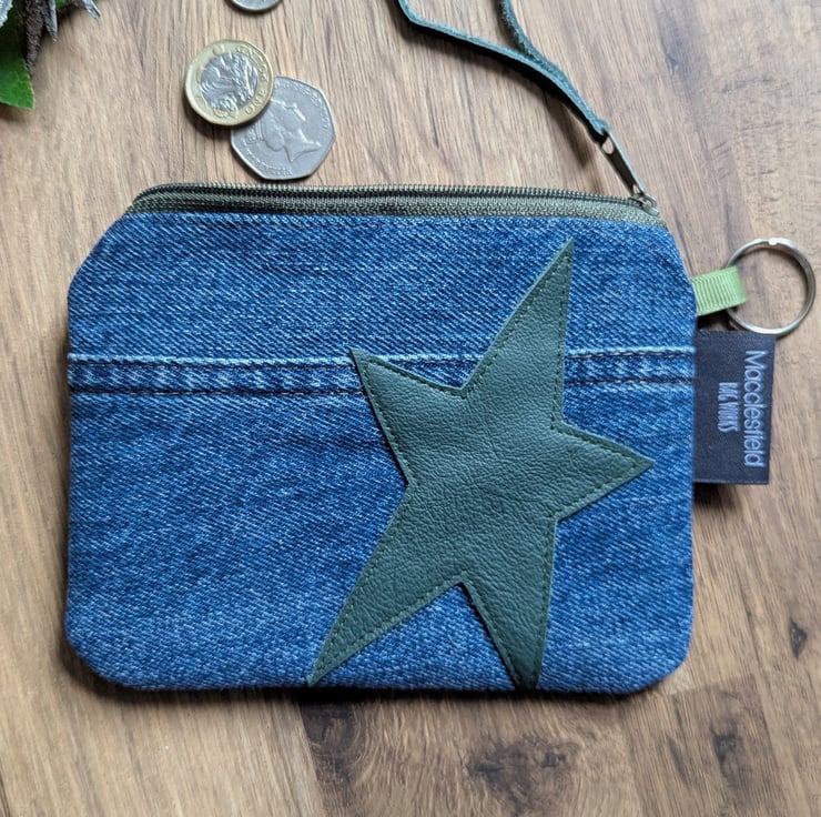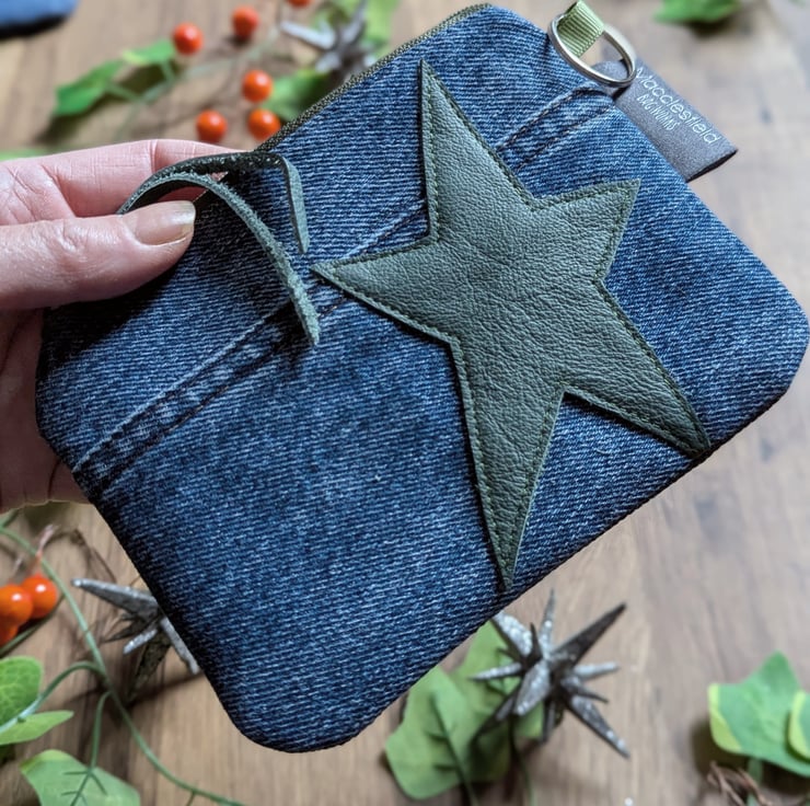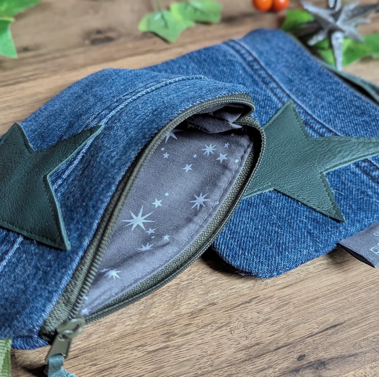 Upcycled denim with a grey star print poly cotton lining lining, this purse or makeup bag has a dark green leather star and zip pull.
