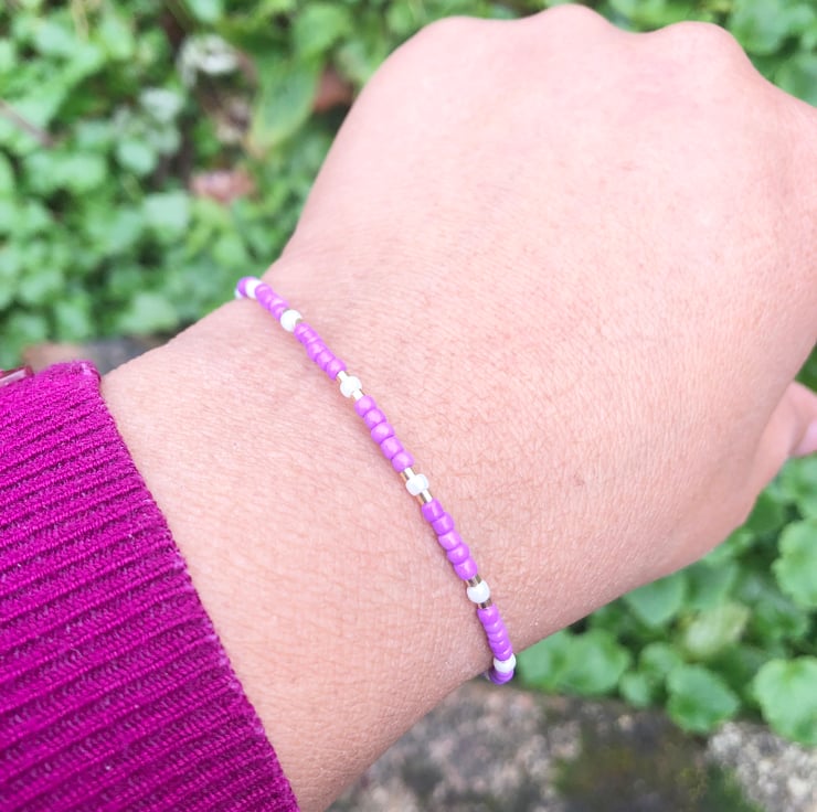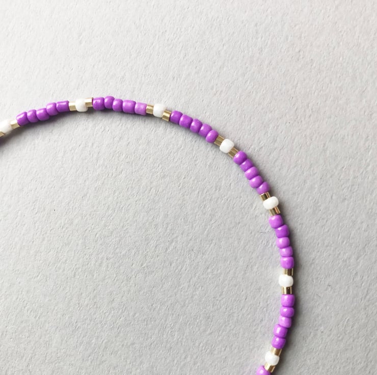 Dainty lilac, white and gold effect handmade seed bead fun bracelet.