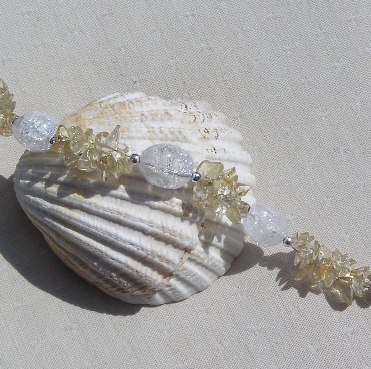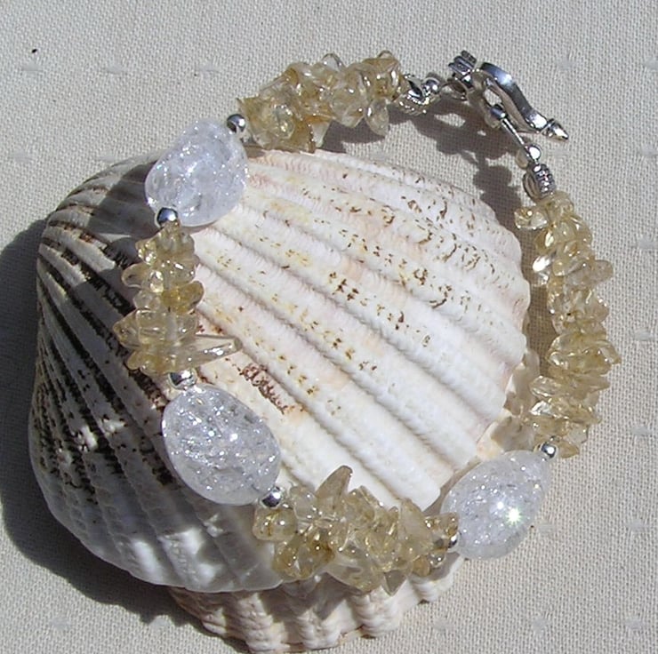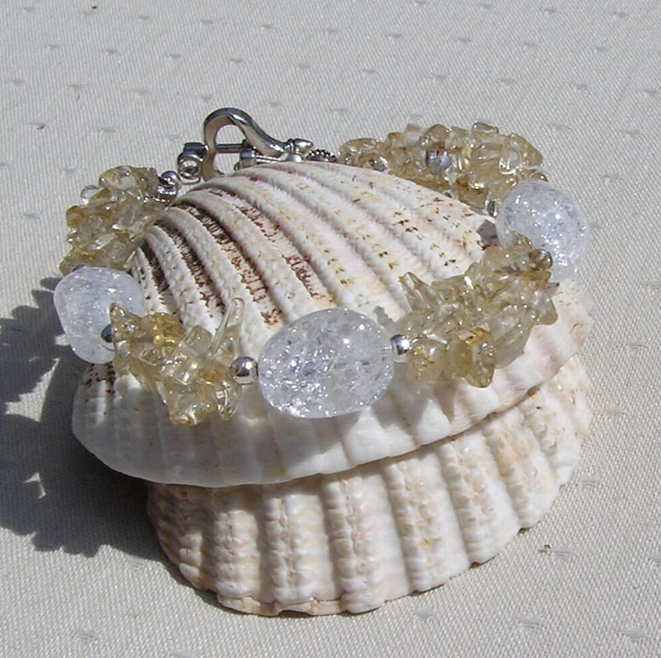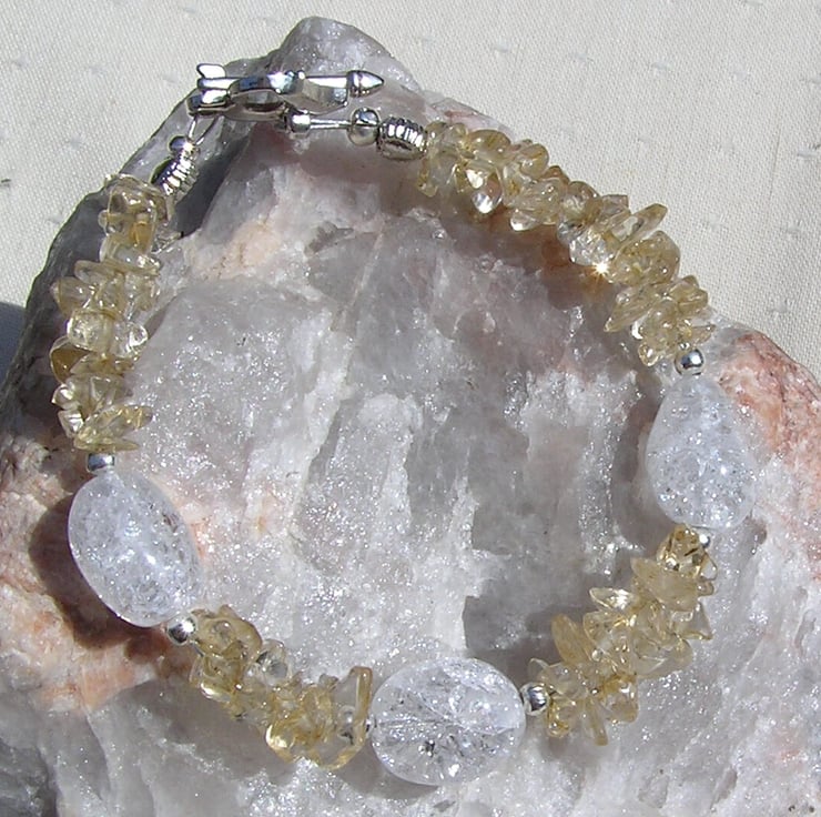 This Stunning Bracelet is made from three Chunky Crackled Quartz Nuggets separated by double-stranded Citrine Gem Chips along with tiny Silver spacers - a Beautiful glistening combination that will look stunning either worn casually or with something more Elegant for a Special Evening out