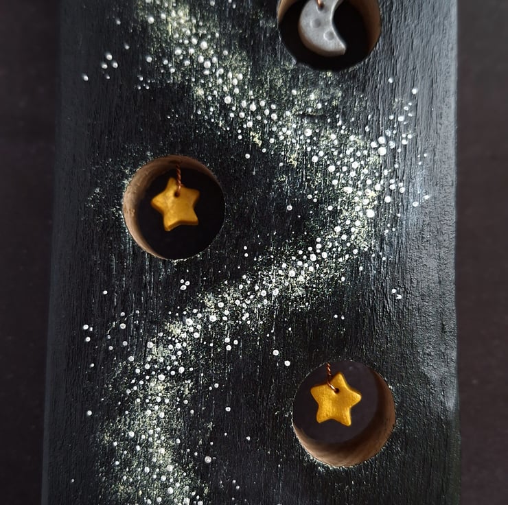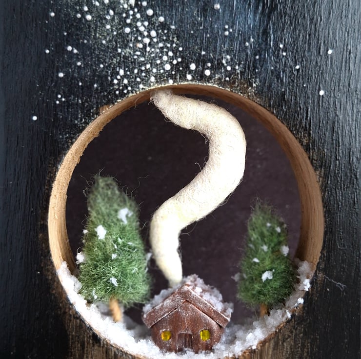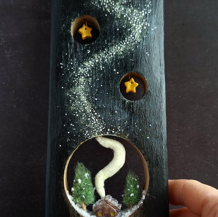 These unique pieces are made from genuine upcycled oak whisky staves. Each piece has a tiny hand sculpted Cabin, with a snowy backdrop, and a hand painted galaxy of stars above it. The piece is finished with a gloss varnish, and has a hidden picture thread on the back to display it.