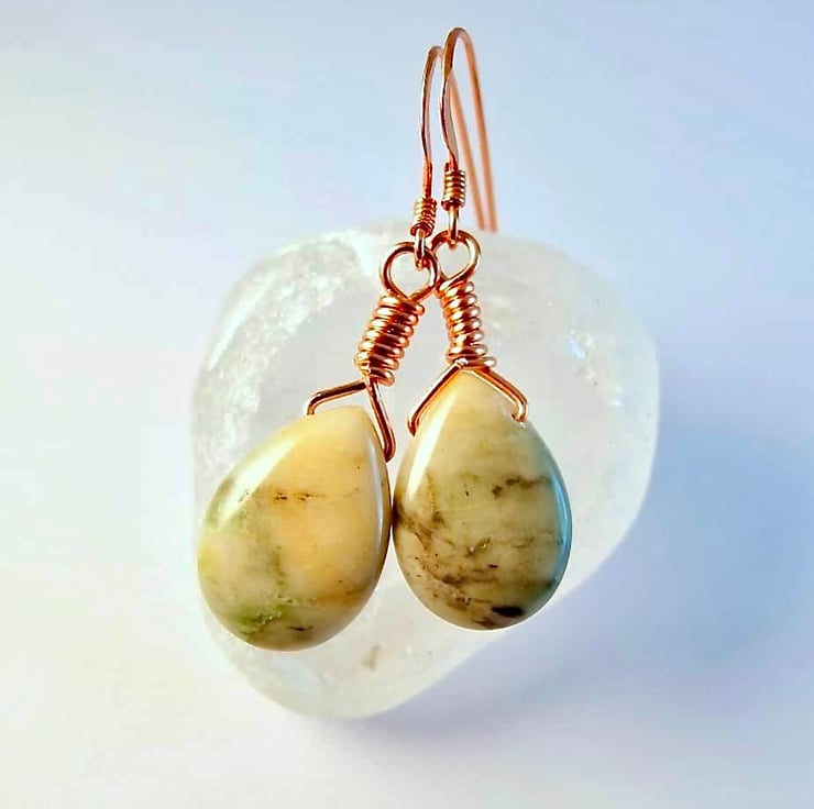 The pair of stones I have chosen for these earrings contain areas of green, ranging from a light sage green to deeper forest shades over an opaque, pale, yellow-green base.