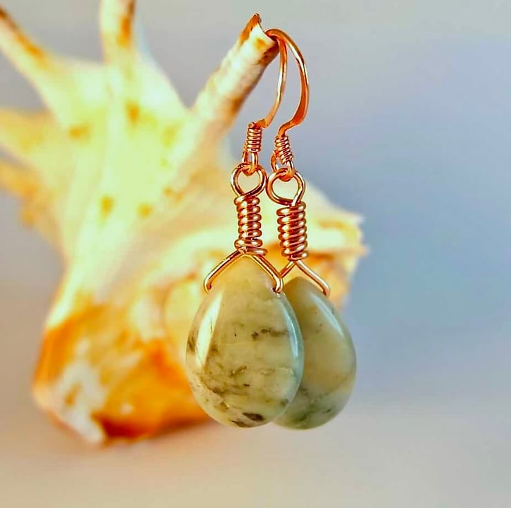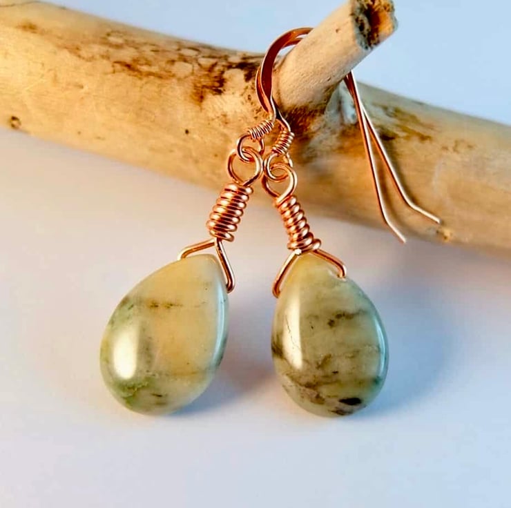 Green teardrop Tree Agate earrings wrapped with copper and attached to copper ear-wires.