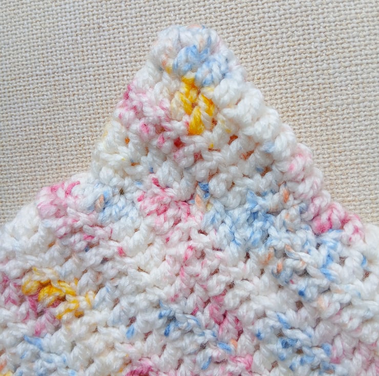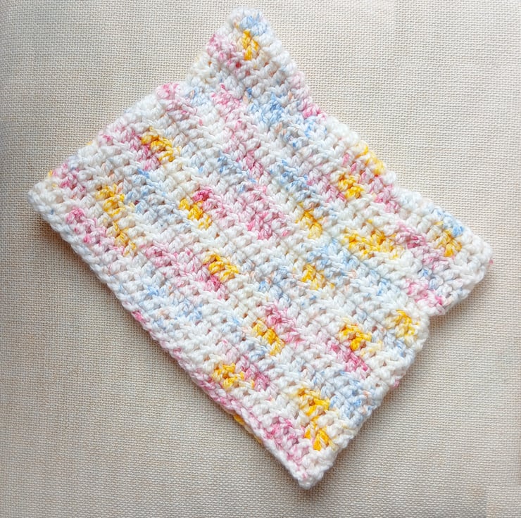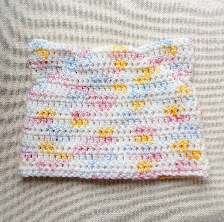 It is made with King Cole Bumble chunky yarn in shade Honey using a 5 mm (H) crochet hook. To fit: adult. Circumference: 58 cm or 23 inches. Finished length: 20 cm or 8 inches.