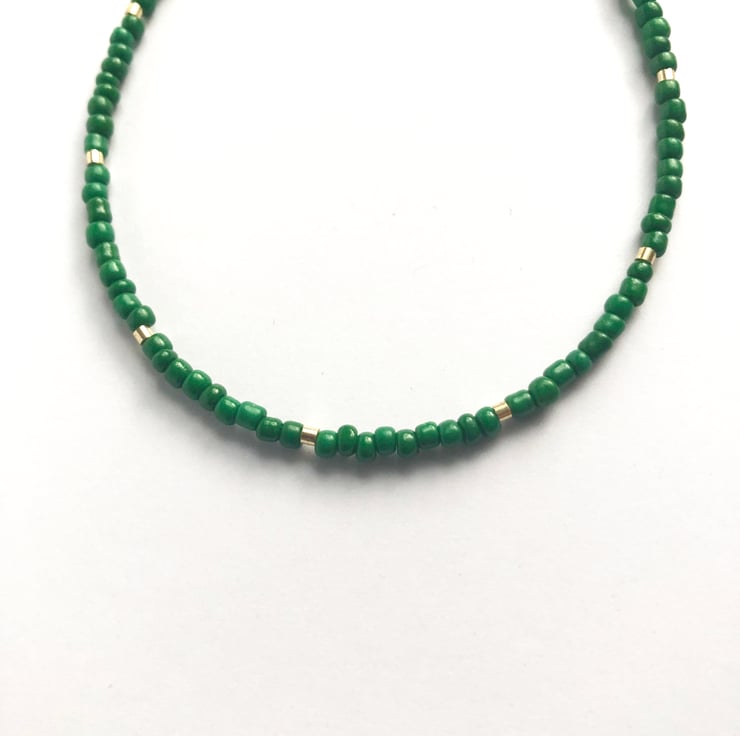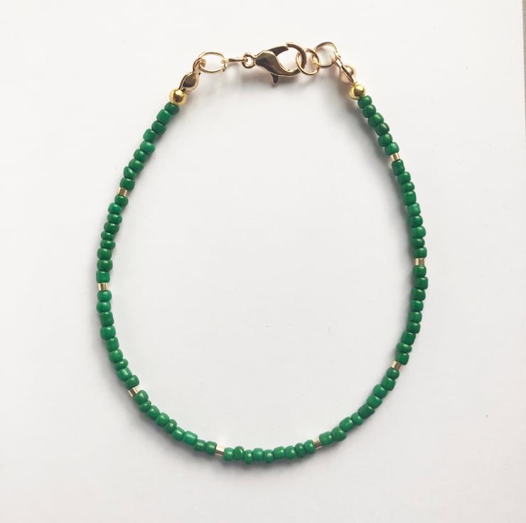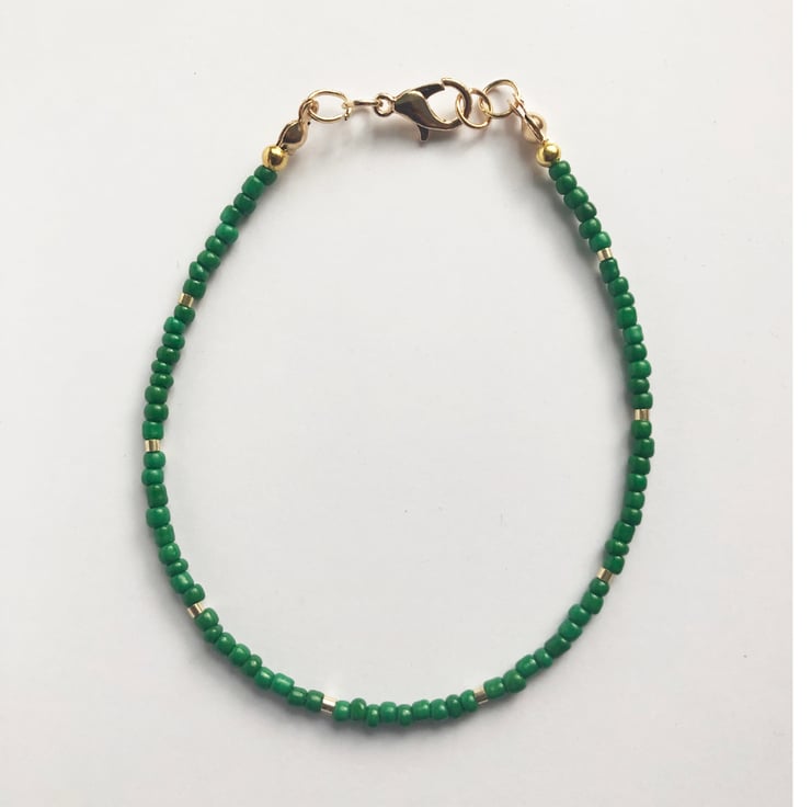 Dainty green and gold effect handmade seed bead fun bracelet.