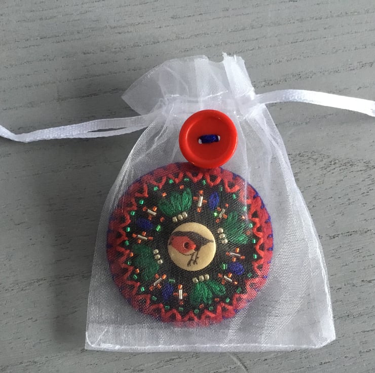 This Hand Embroidered Festive Robin Brooch is gift wrapped in an organza bag. Also a protective bag to keep the brooch in when not worn.