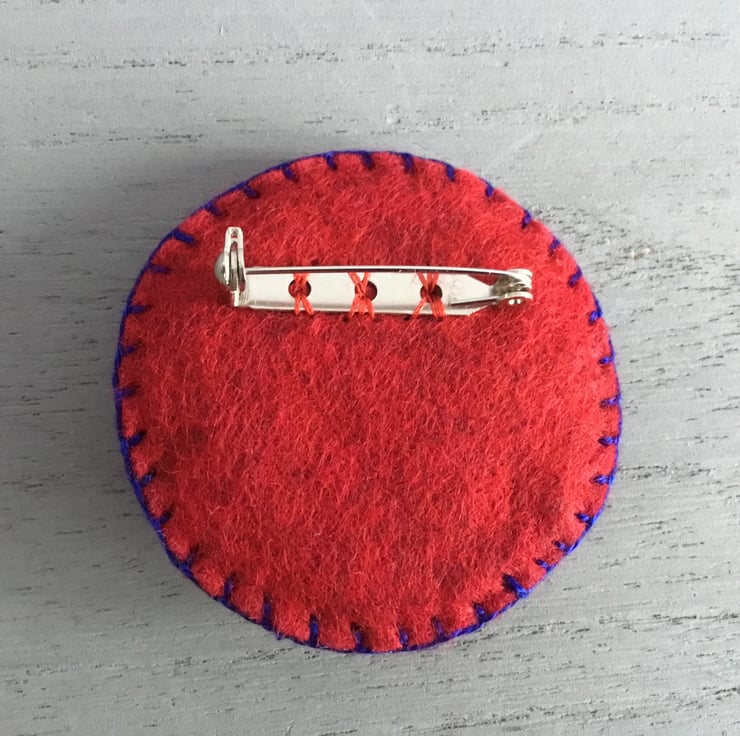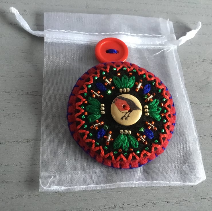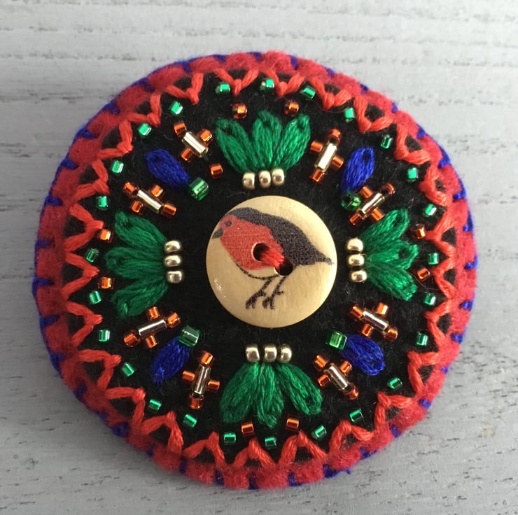 This hand embroidered festive brooch is in the lovely festive colours of Christmas…..red, green, blue and golden yellow. A wooden button with a painted Robin is sewn onto circles of black and red wool felt. Hand embroidered Lazy Daisy and Fly Stitches surround this lovely Robin button, with golden, red and green bugle and seed beads that twinkle in the festive light. The brooch is edged with blue Blanket Stitches.