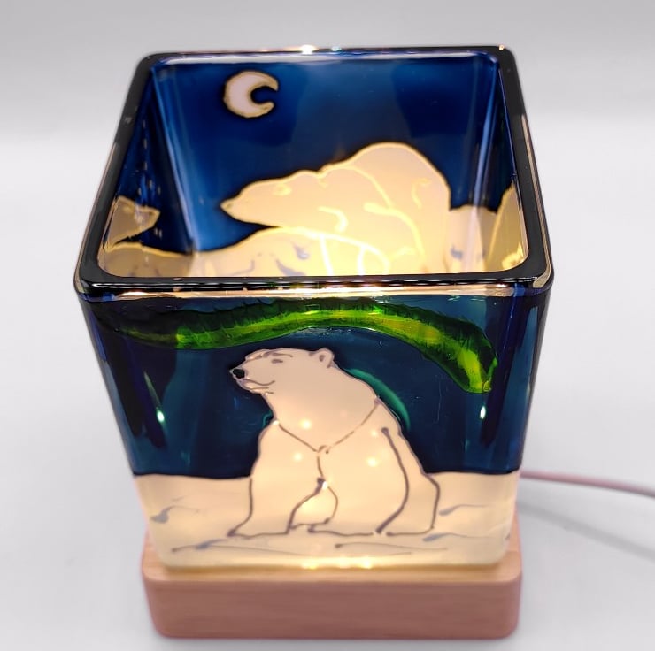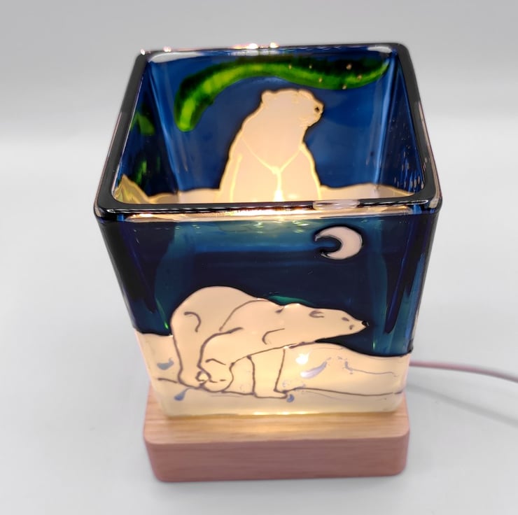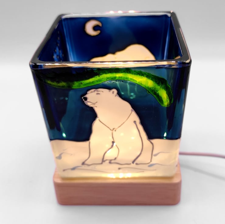 Hand painted glass candle holder, 7.5cm x 7.5cm, depicting two polar bears in the snow, under the Aurora Borealis on a dark winter's night