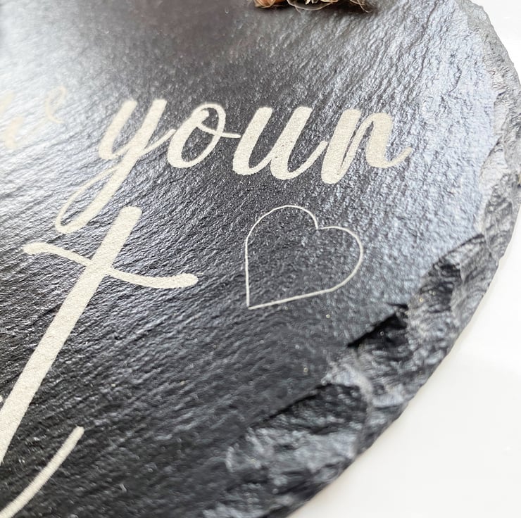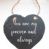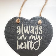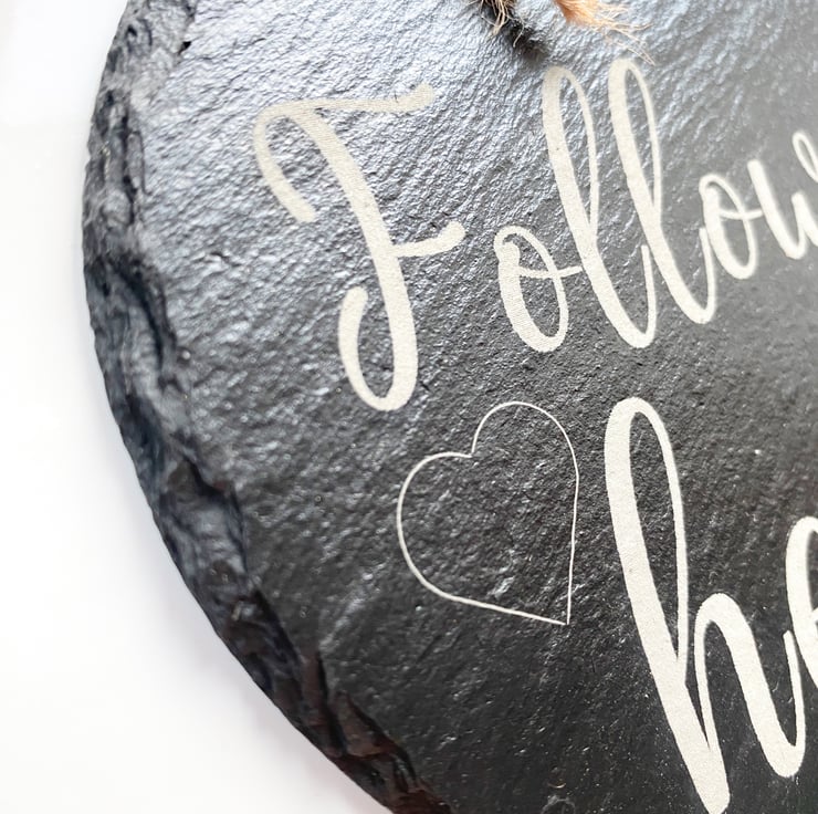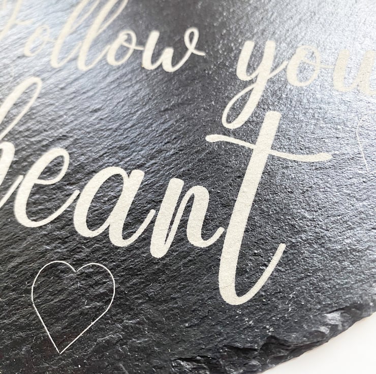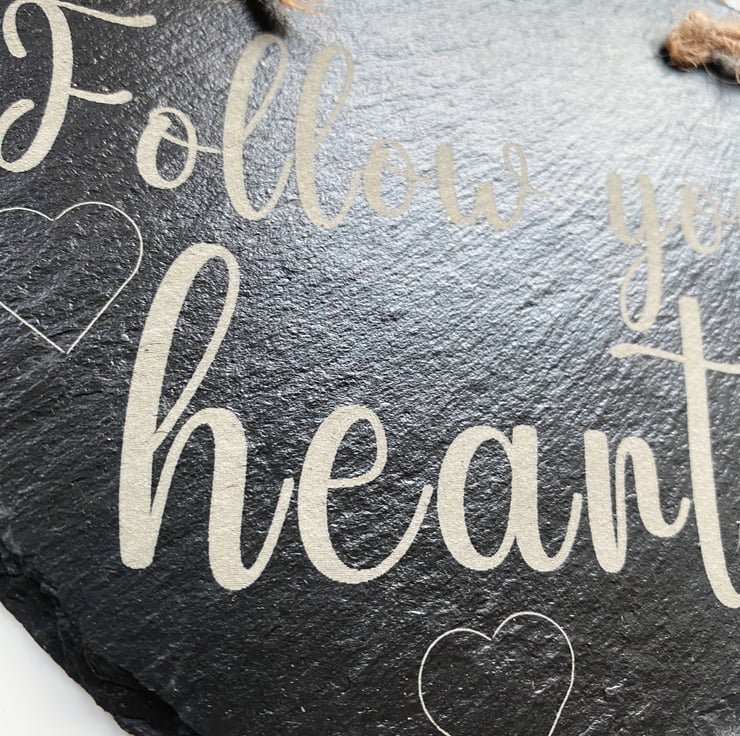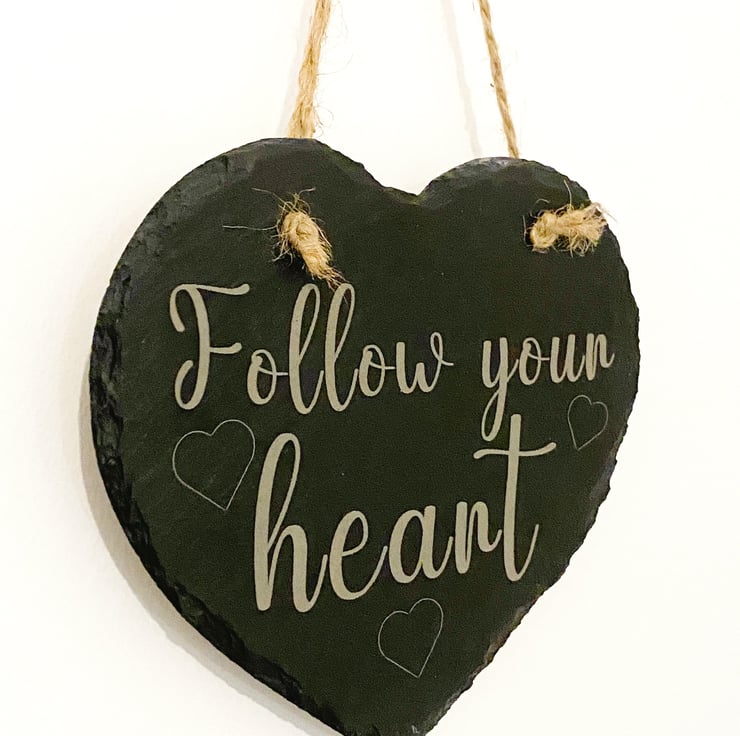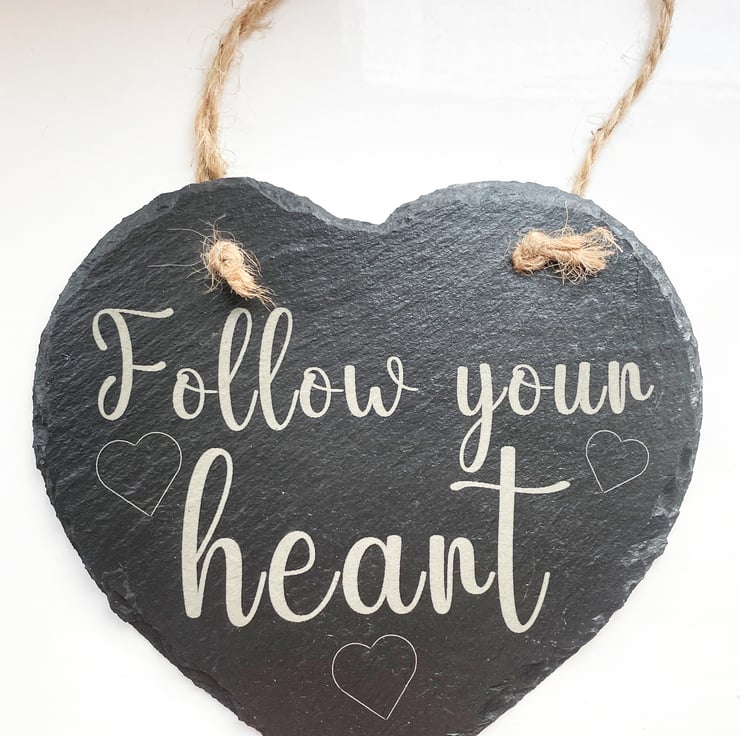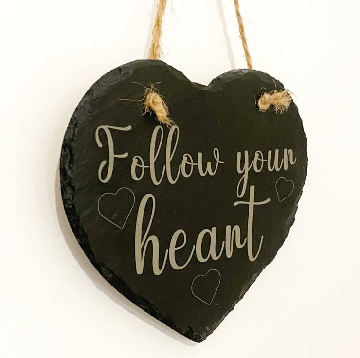 Give a sentimental gift to adorn any wall. This beautiful slate Heart with a loving sentiment, "Follow your heart", engraved, will please anyone receiving it. The Heart is approximately 150mm x 160mm x 5mm thick and hangs from a rustic string.