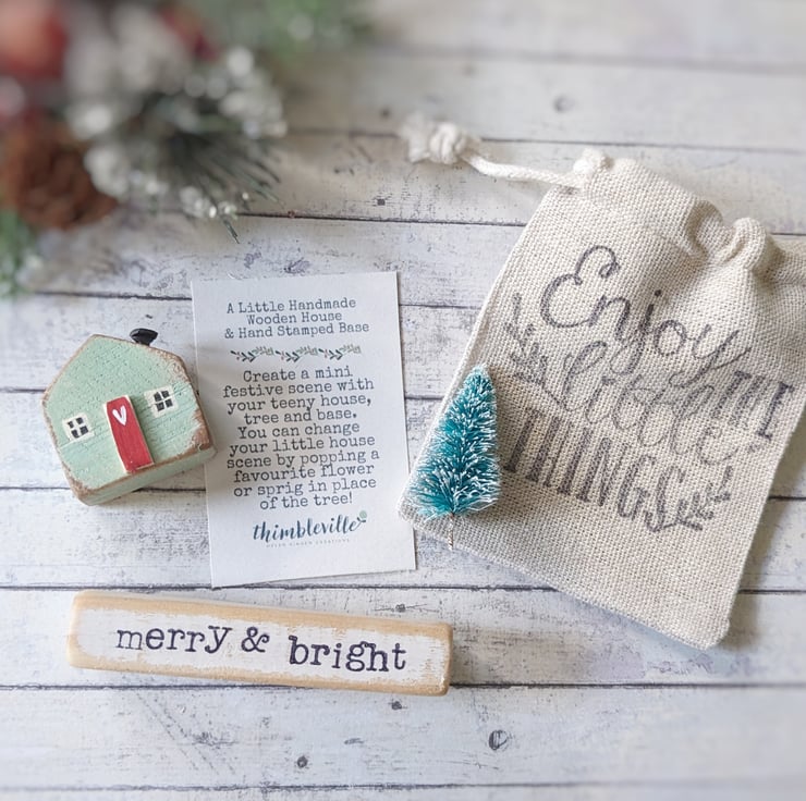 A teeny wooden house scene in a bag, with a festive tree that you can change to your own decoration!