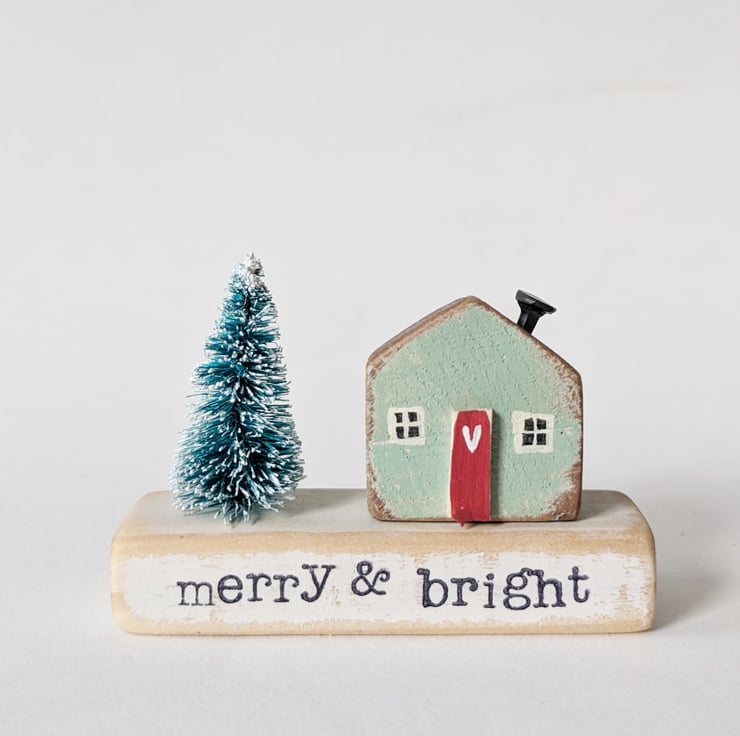 On a painted wooden base stamped with the words merry & bright, add your teeny painted house and tree.