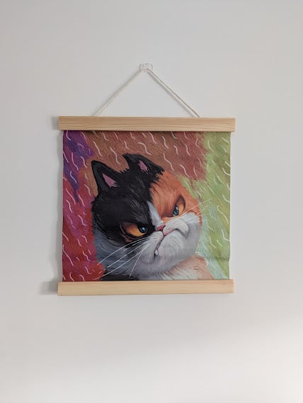 The artist wanted to visually capture that boiling point of personality. The cat’s intense, focused stare and puffed cheeks are set against a chaotic, fiery background of reds, oranges, and greens. This expressive brushwork visually represents the internal turbulence and the huge, disproportionate mood swings that make cats so hilariously captivating.