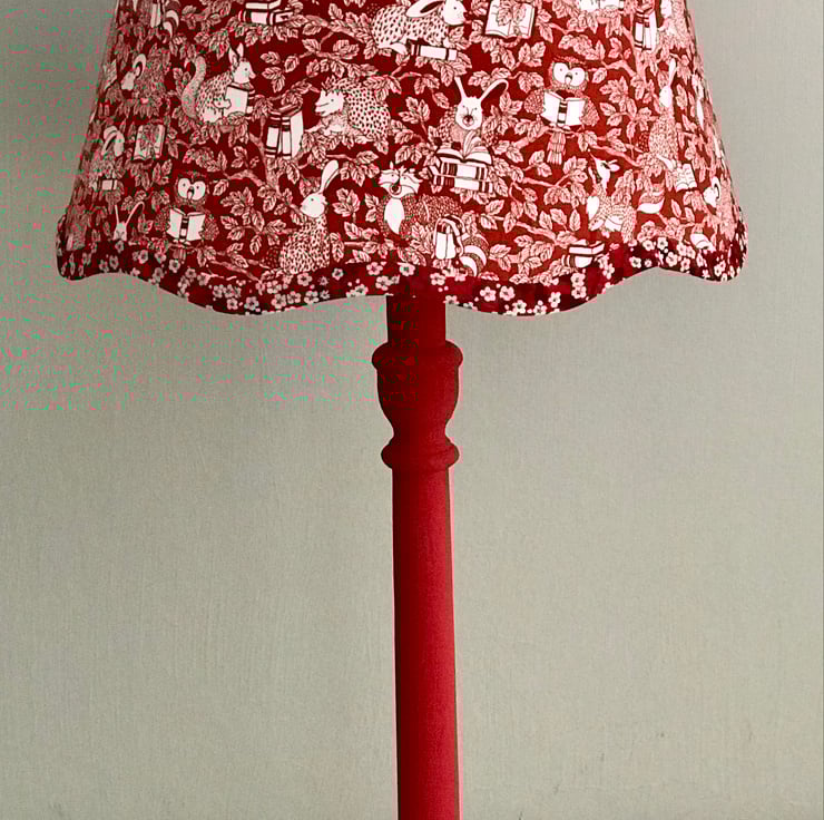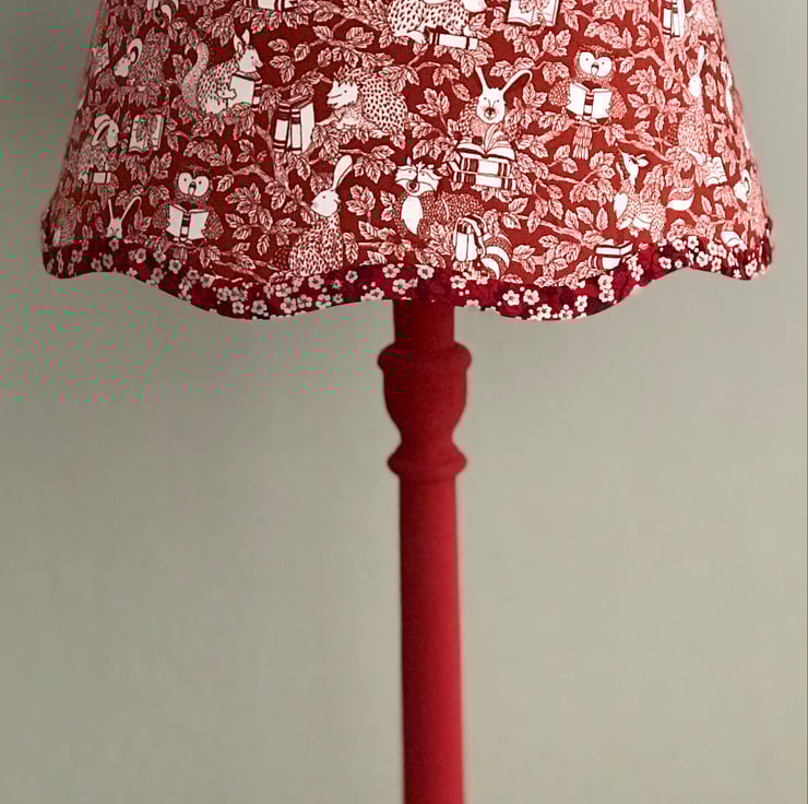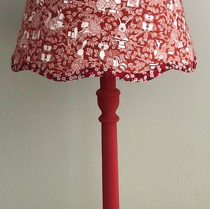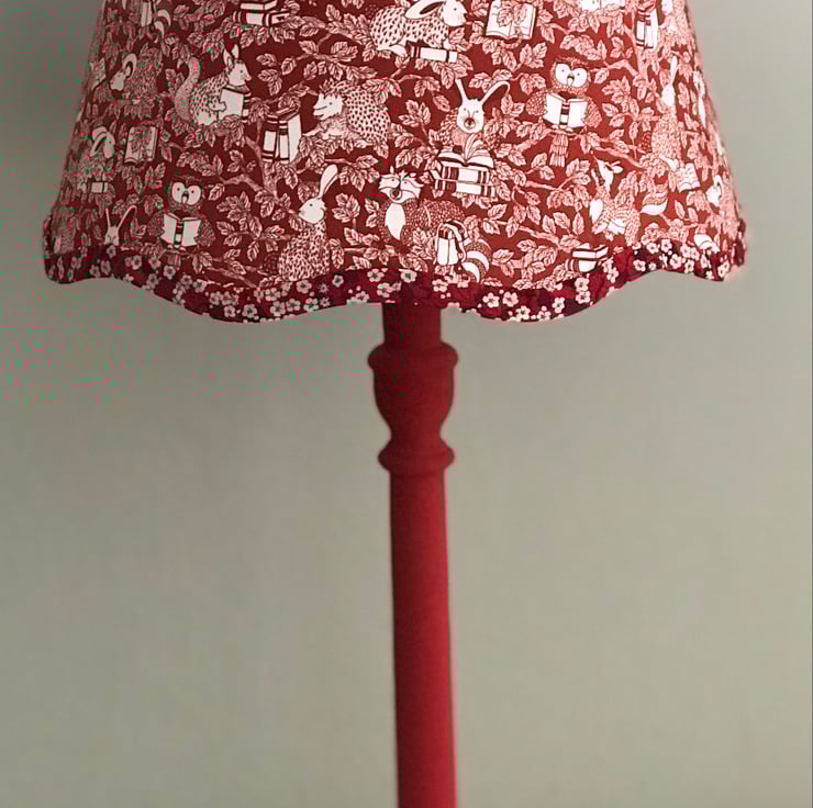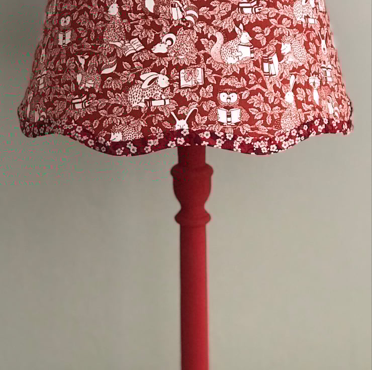 Such a delightful Liberty print featuring Woodland Animals in a Woodland Library in Berry Red, Finished with a Liberty Mitsi Red Ruby Trim, Scalloped lampshade looks simply lovely lit up.