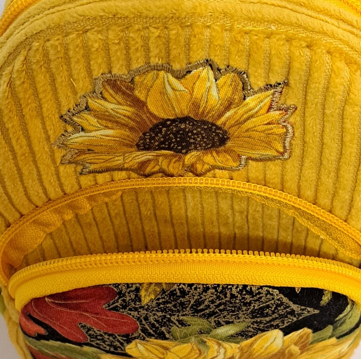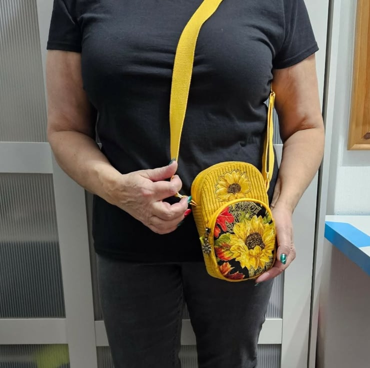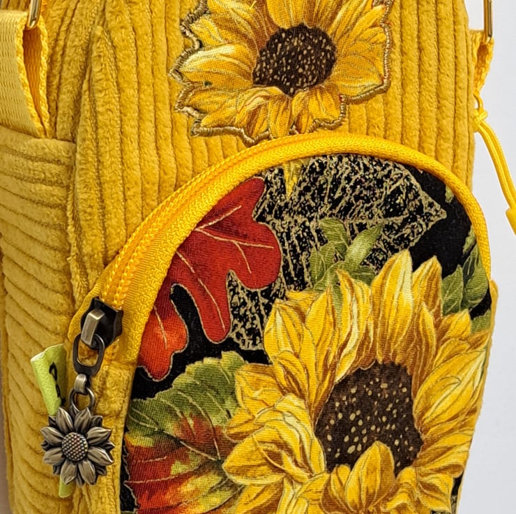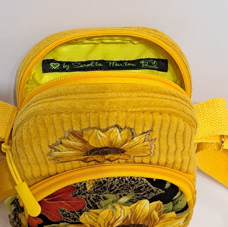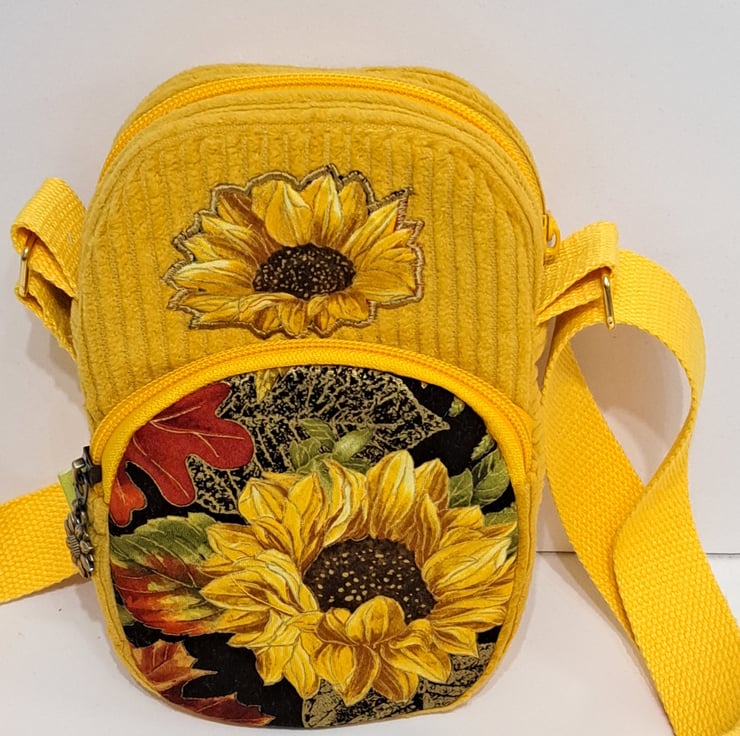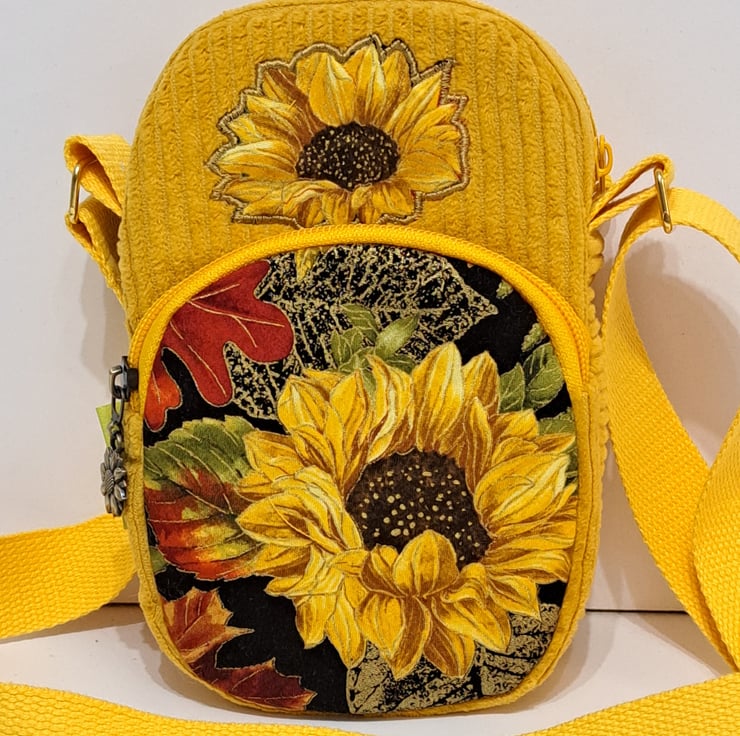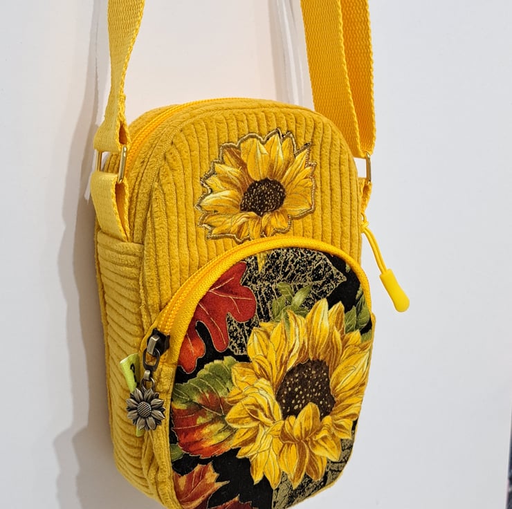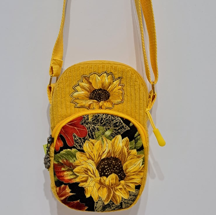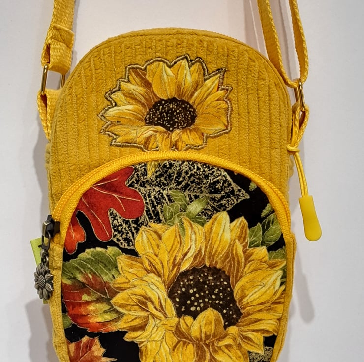 Small mustard yellow corduroy phone pouch bag with sunflower and autumn leafs pattern. The mini handbag decorated with applique sunflower. The bag has front pocket with zip closure, sunflower on the zipper. The handbag closing with zip on the top of the bag. The main fabric is corduroy, decorated with cotton fabric. The lining made from waterproof fabric. The shoulder strap is adjustable with golden metal clasps, maximum length approximately 140cm. This bag ideal for essentials as mobile phone, keys and passport if you take with you for holidays. The front pocket perfect for your keys. This is a small shoulder bag, the dimensions are the following: hight 20cm, width 13cm and depth 5cm.