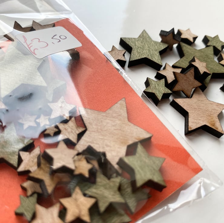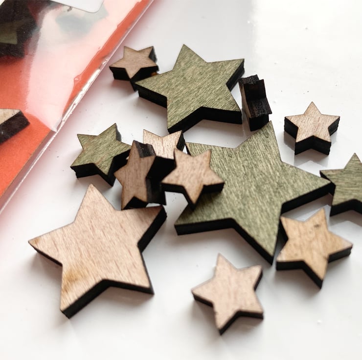 These wooden shapes are ideal for crafters. Made from 3.6mm hardwood ply. This is a mixed bag of Stars with sizes ranging from 2mm to 20mm. Some are Green in colour, and others are plain wood.