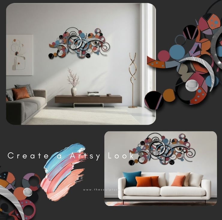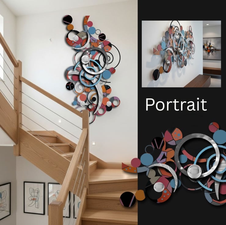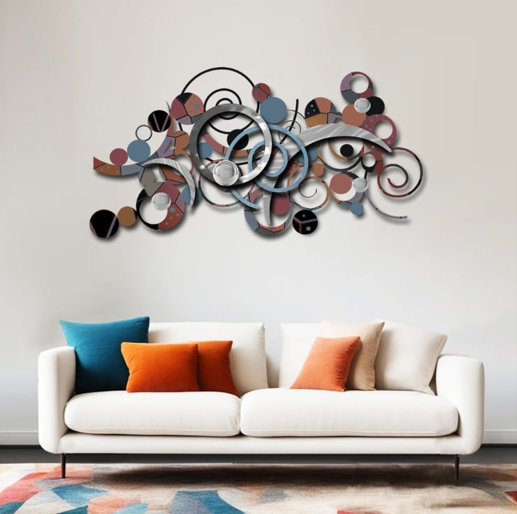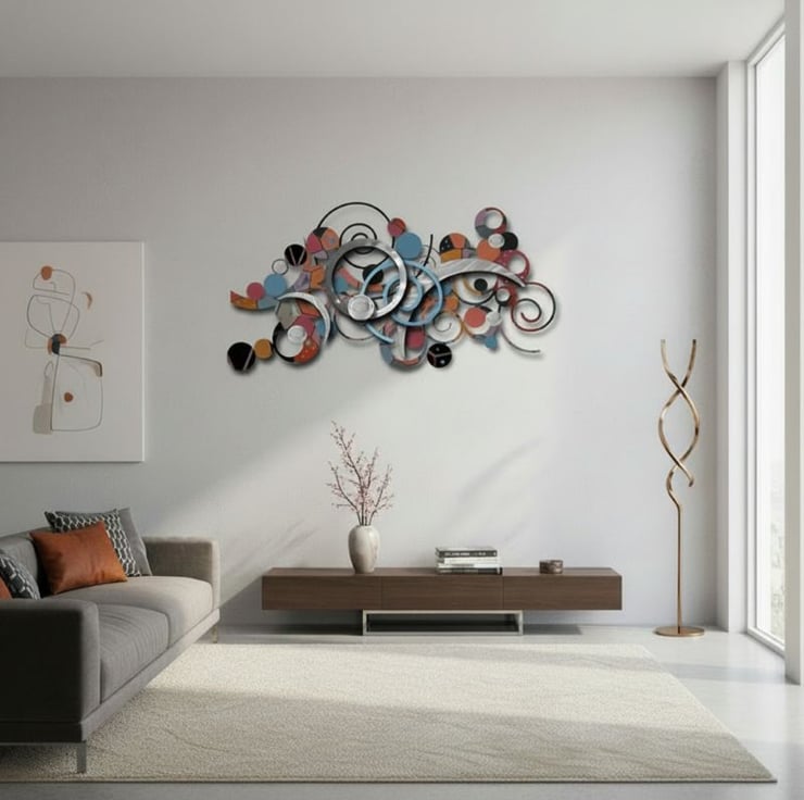 This design was inspired by the vibrant energy of modern architecture and the interplay of colour found in urban landscapes. I wanted to create a wall sculpture that captures movement and flow, using dynamic blue and orange geometric shapes alongside swirling metallic accents. The two-section format allows for flexibility in installation and echoes the layered look of contemporary interiors. Each piece is crafted to evoke creativity, positivity, and bold self-expression—a true celebration of modern art for your home.