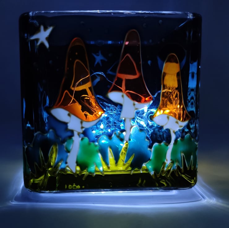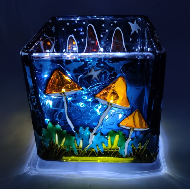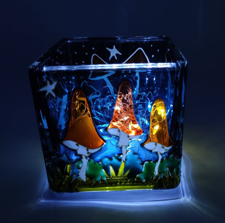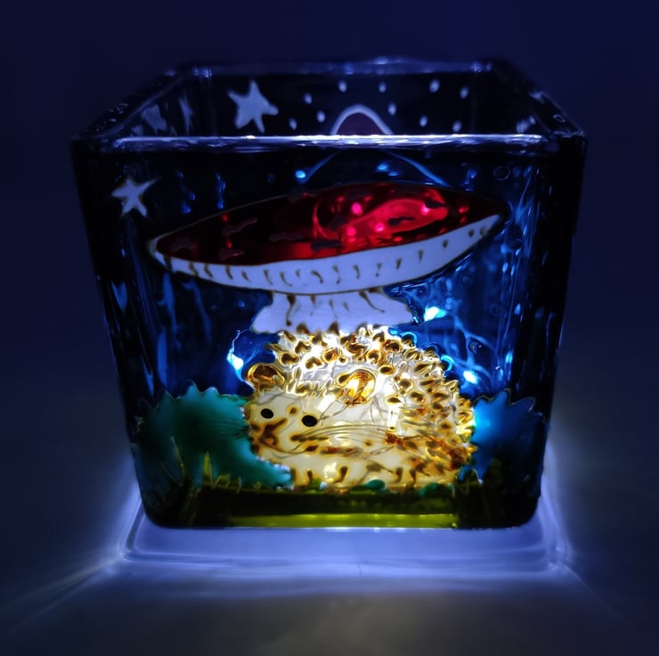 Candle holder, hand painted glass, hedgehog, mushrooms, toadstools