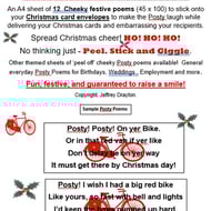 Set of 12 sticky labels (approx. 45mm x 100mm) on an A4 sheet, each printed with an amusing, cheeky poem with a background red Posty bike to stick on your Christmas card envelope! Give your Posty a laugh and add a mischievous twist to your festive mail. Instead of sending ordinary cards that are quickly forgotten, you’ll create excitement, embarrassment, and anticipation for you waiting for that call from your recipient who’s been delightfully caught out by your naughty little surprise. Sending Christmas cards will no longeer be a chore, IT WILL BE FUN! Free UK Postage — peel, stick, giggle and no extra cost for delivery!