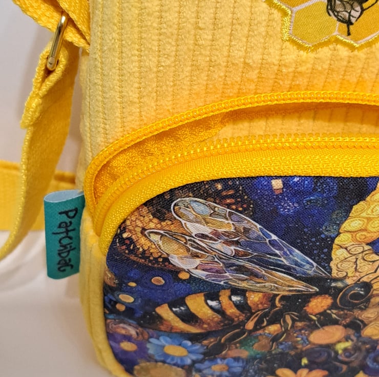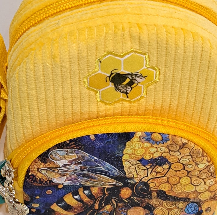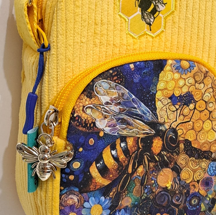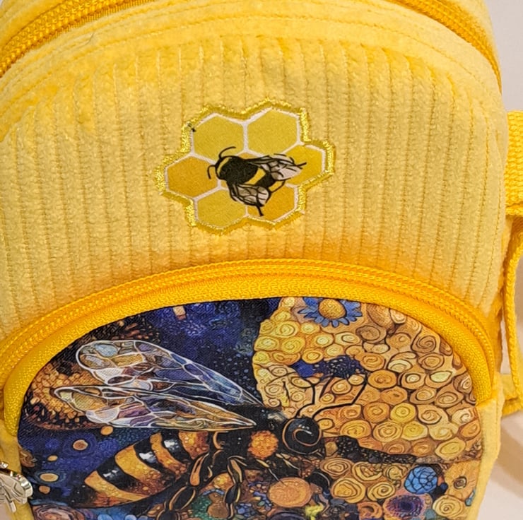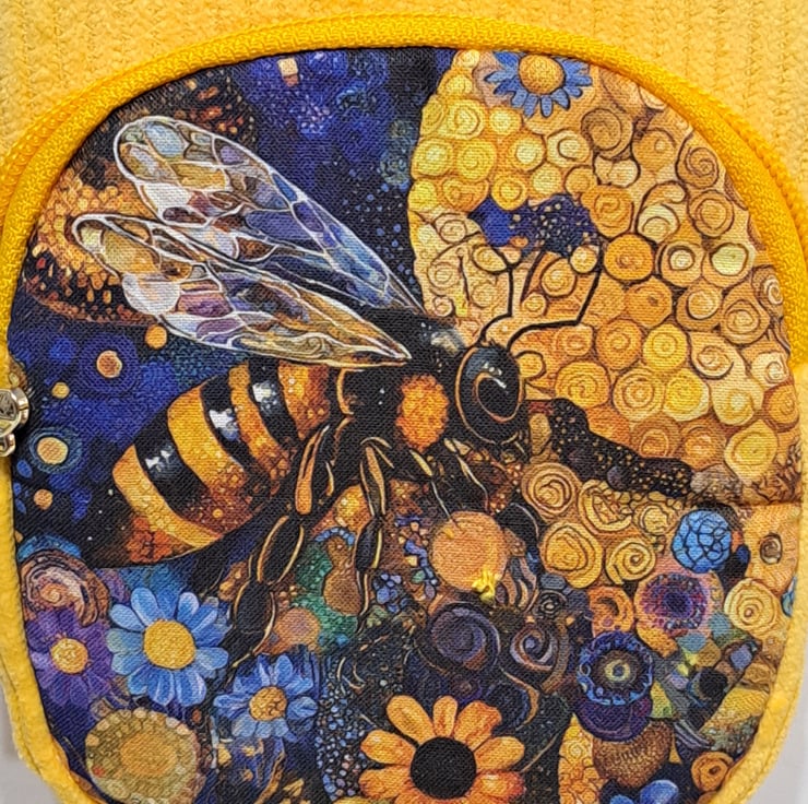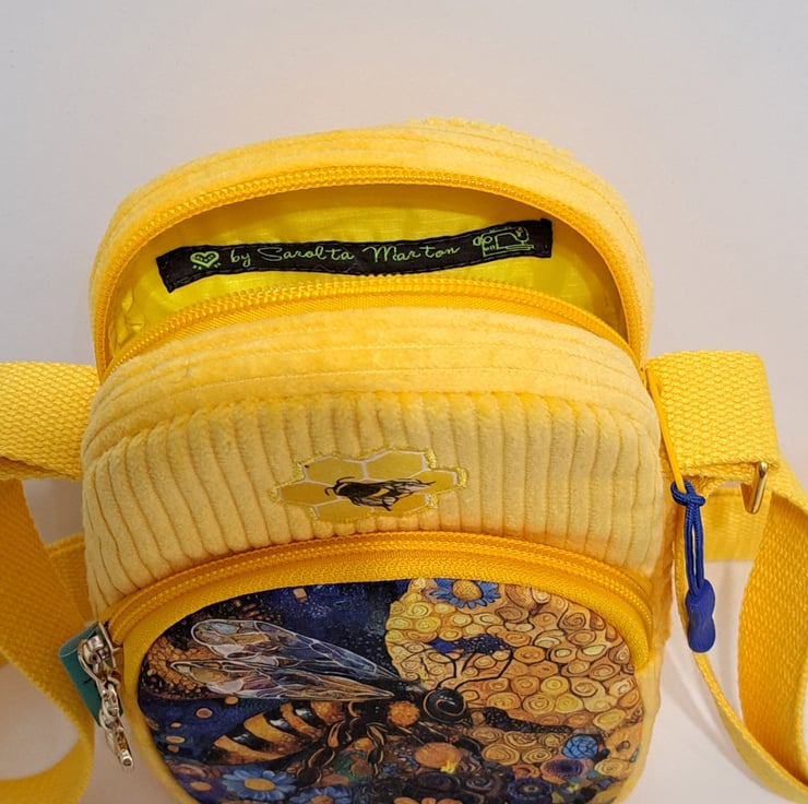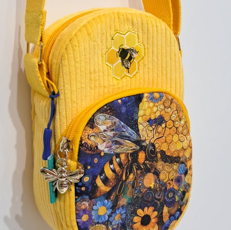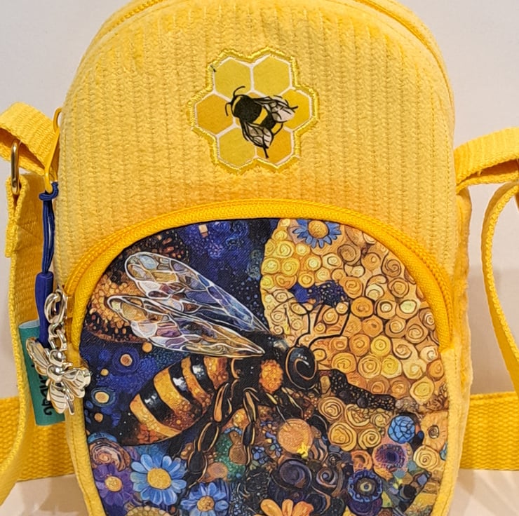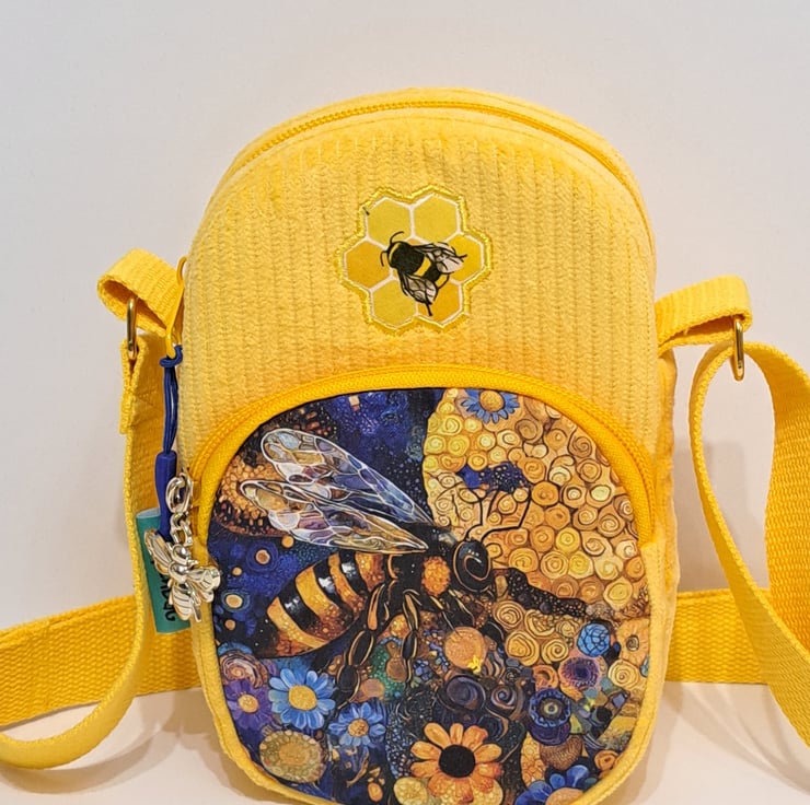 Light yellow corduroy mini phone pouch bag with bees and flowers . I used for my bag Gustav Klimt style fabric . The small shoulder bag decorated with applique bee. The main fabric is corduroy decorated with cotton fabrics. The lining made from waterproof fabric. The shoulder strap is adjustable with golden metal clasps, maximum length approximately 140cm. The bag has front pocket with zip closure, bee charm on the zipper. The handbag closing with zip closure on the top. The dimensions of the bag are the following: hight 20cm, width 13cm ,depth 5cm. This little bag ideal for essentials as mobile phone, keys, and can put in your passport if you are take with you for holidays.
