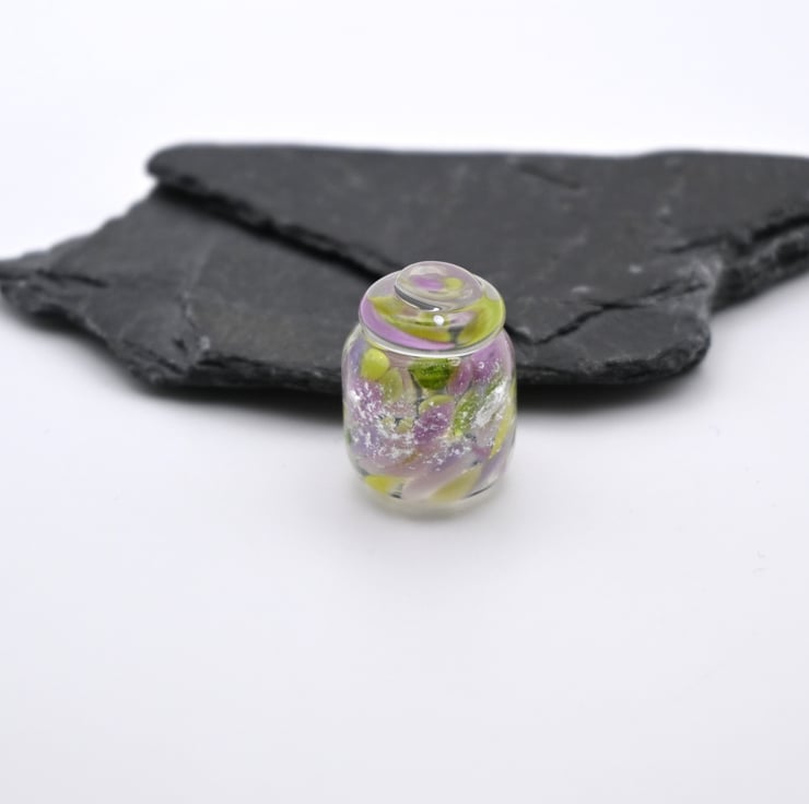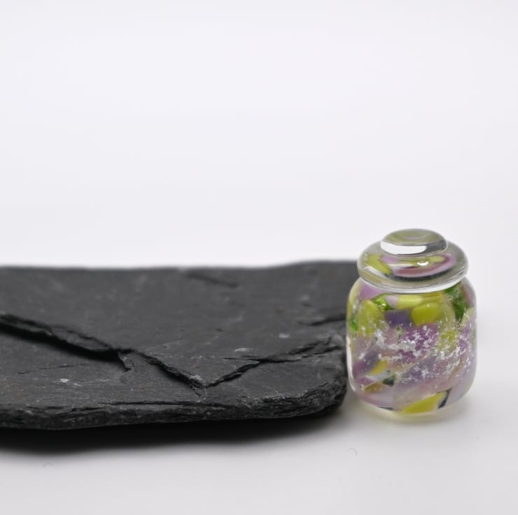 A small glass jar of magic made by hand using a technique called lampworking.