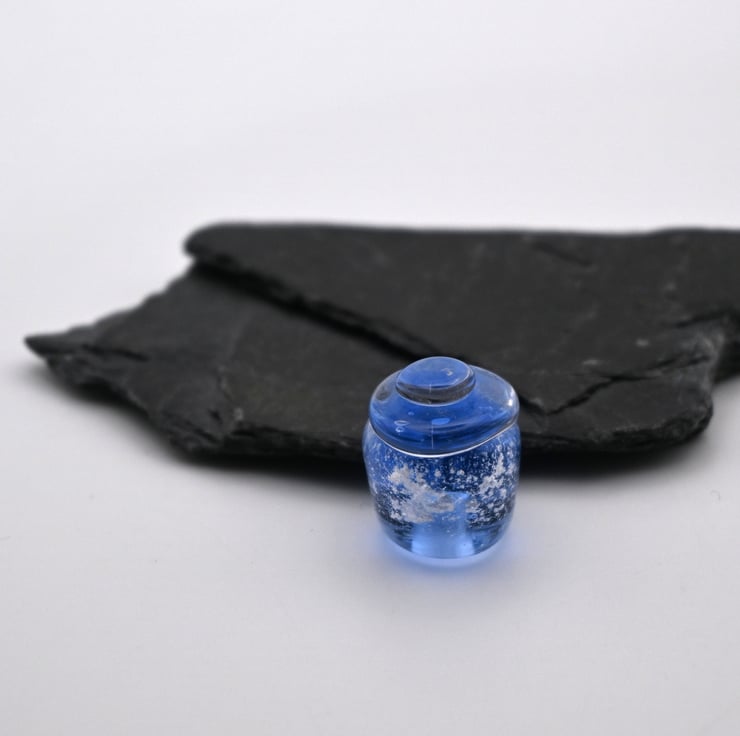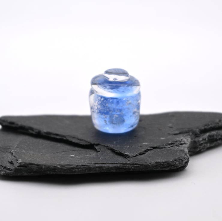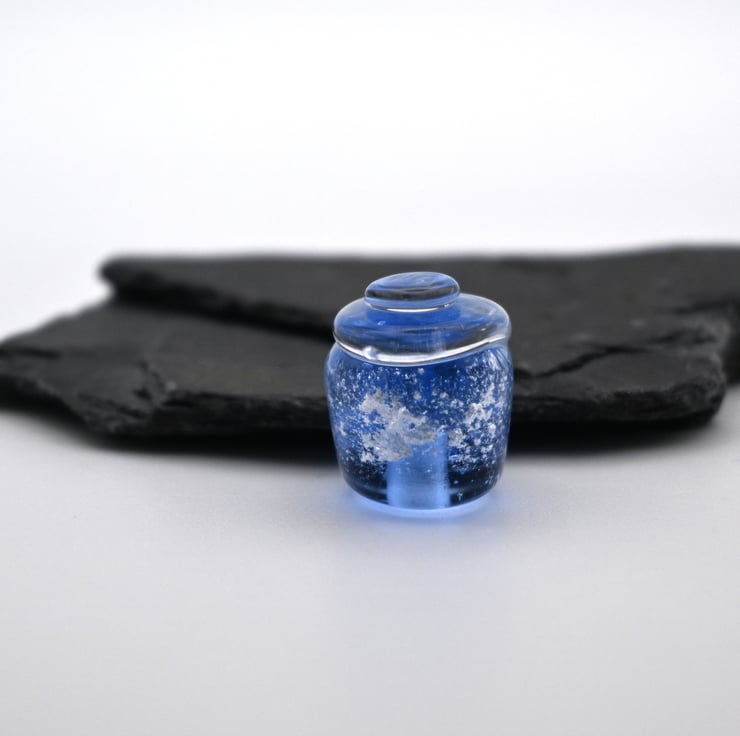 A small glass jar of magic made by hand using a technique called lampworking.