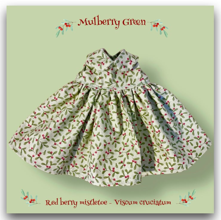 A lovely little green dress in a red berry mistletoe print, to fit the Mulberry Green characters. The dress is made from best quality cotton and has a lined bodice and Peter Pan collar.
