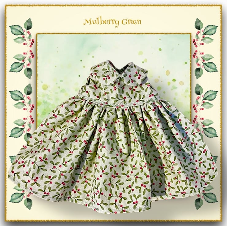 A lovely little green dress in a red berry mistletoe print, to fit the Mulberry Green characters. The dress is made from best quality cotton and has a lined bodice and Peter Pan collar.