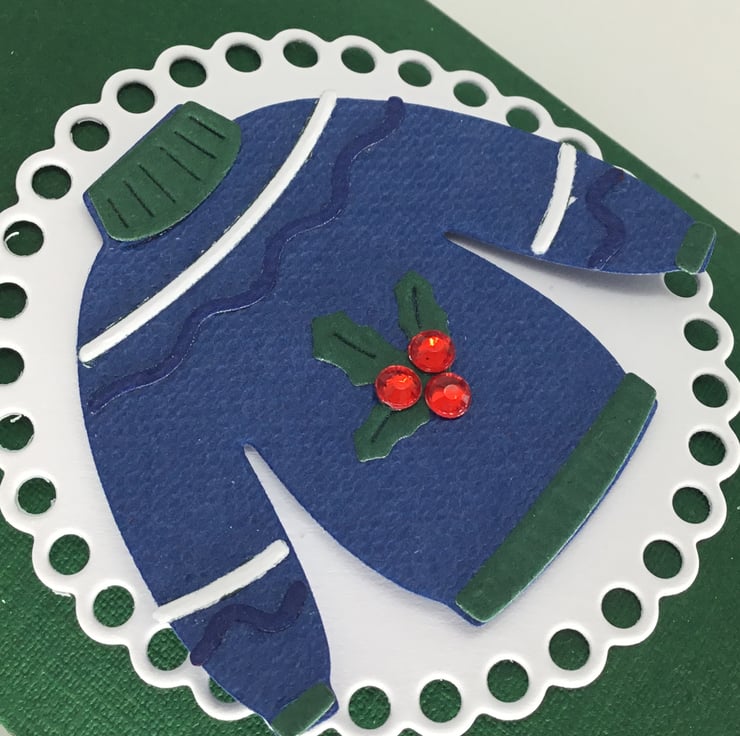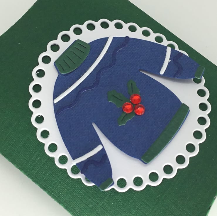 A handmade pillow Christmas gift box, perfect for sending a cash gift or small present, such as jewellery. Unfortunately it is slightly too small to fit a gift card. The box itself has been cut from green card. It is decorated with an intricate, textured, navy blue, die cut Christmas jumper, featuring a sprig of holly with red adhesive gem berries to add a little sparkle. The jumper has been mounted on a white, circular background.