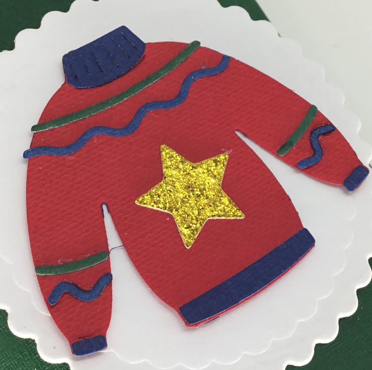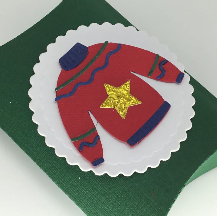 A handmade pillow Christmas gift box, perfect for sending a cash gift or small present, such as jewellery. Unfortunately it is slightly too small to fit a gift card. The box itself has been cut from green card. It is decorated with an intricate, red die cut Christmas jumper, featuring a gold, glitter card star, to add a little sparkle. The jumper has been mounted on a white, circular background.