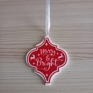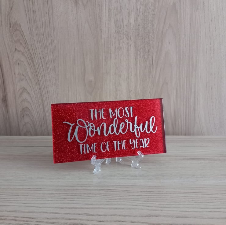 A Red decorative glitter subway tile with a vinyl design in silver/grey saying "The Most Wonderful Time Of The Year". Displayed on a sturdy plastic stand.