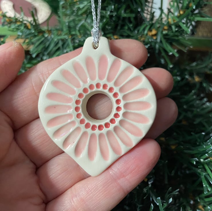 This ceramic bauble decoration has a lovely bright design with a little hole in the middle. It's really cheerful! It is made from white earthenware clay and fired once, then glazed and fired again. It measures 5.5cm length and 4cm width and 0.5cm deep and hangs from a glittery red thread.