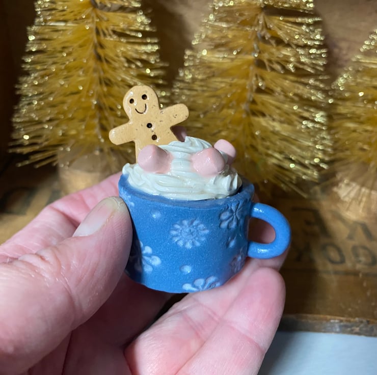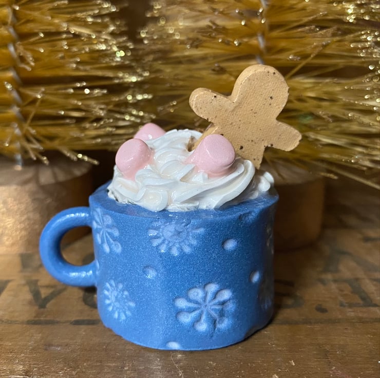 This cute little ceramic Christmas decoration features a gingerbread man swimming in a mug of hot chocolate and marshmallows. It has been made from white eartheware clay with a little speckled gingerbread man. It has been fired twice in a pottery kiln. It measures 4.5cm x 4cm