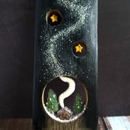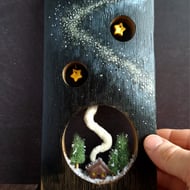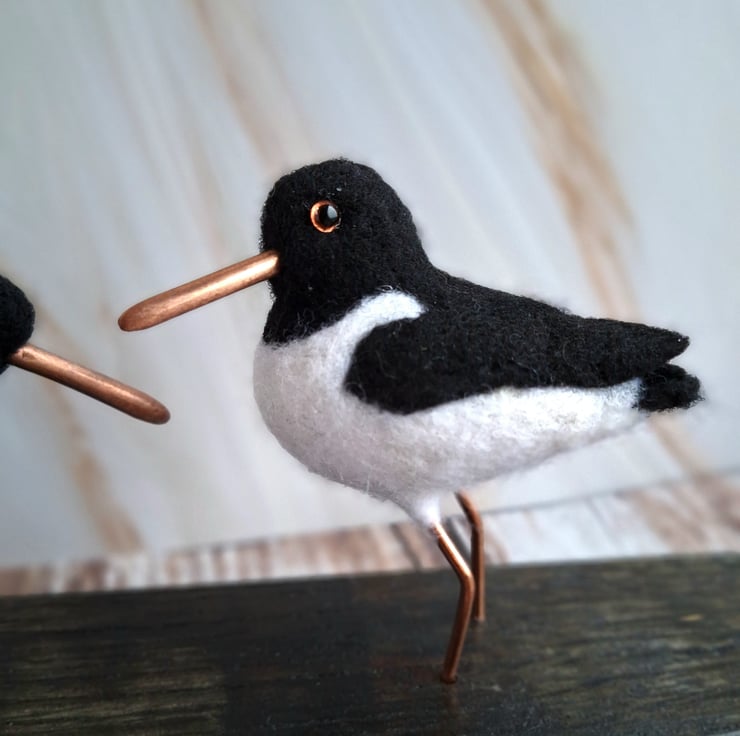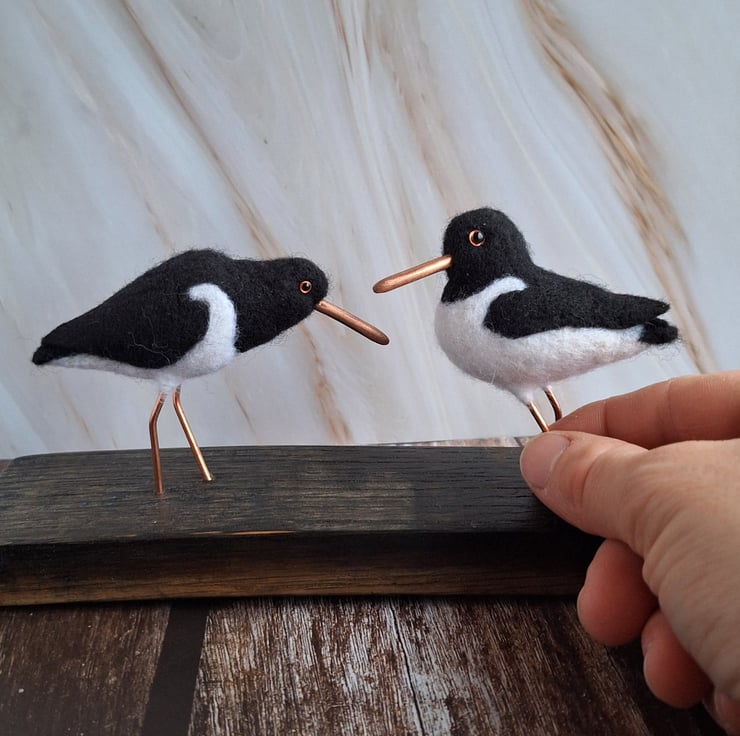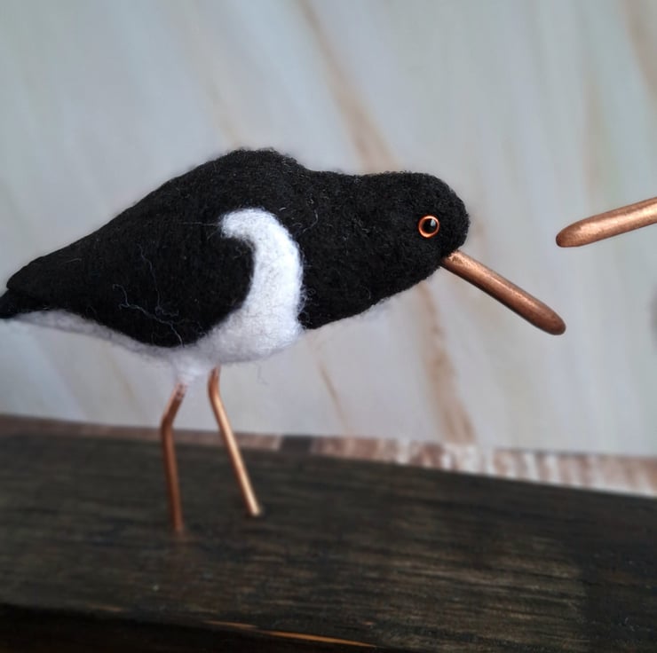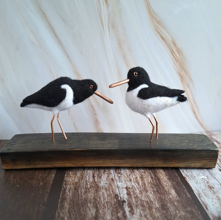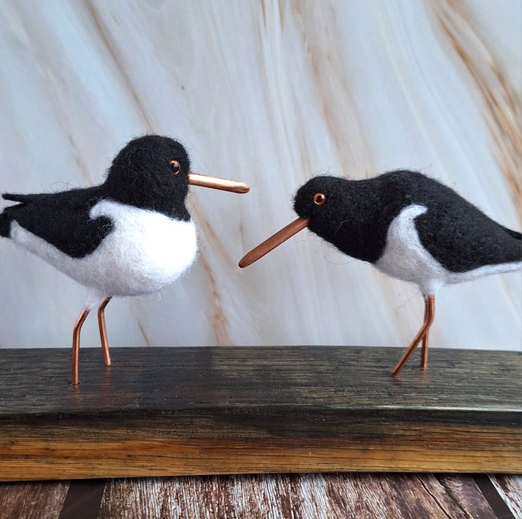 This beautiful pair of Oystercatchers are handmade from soft felted wool, and mounted on a genuine piece of oak whisky stave. Their beaks and legs have been carefully hand crafted from copper wire, and each bird has tiny glass eyes in the characteristic orange of real Oystercatchers.