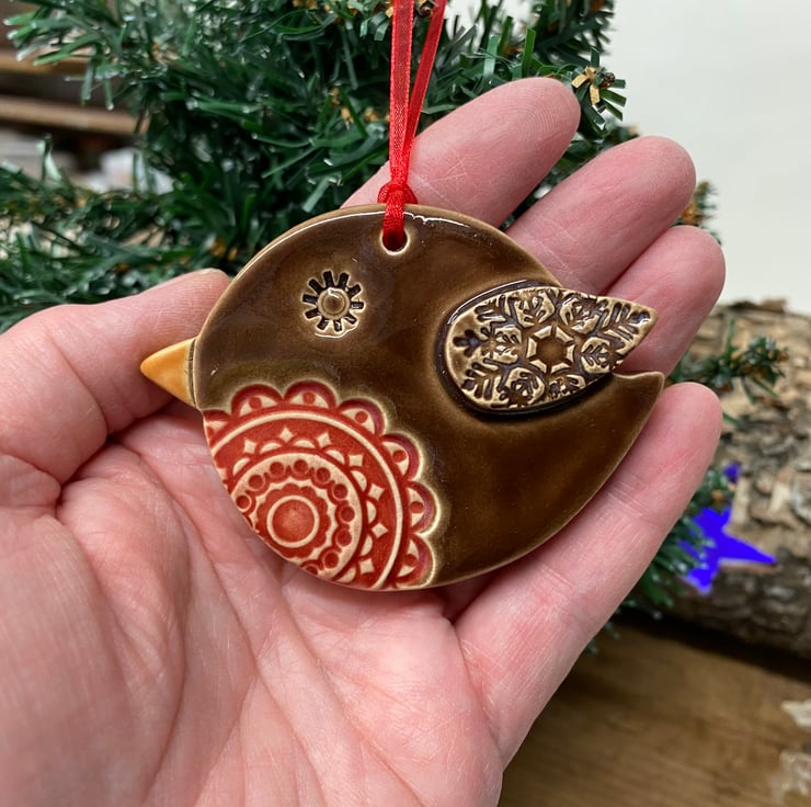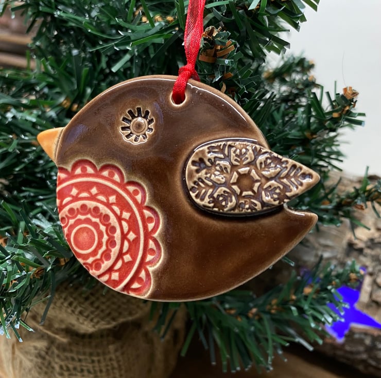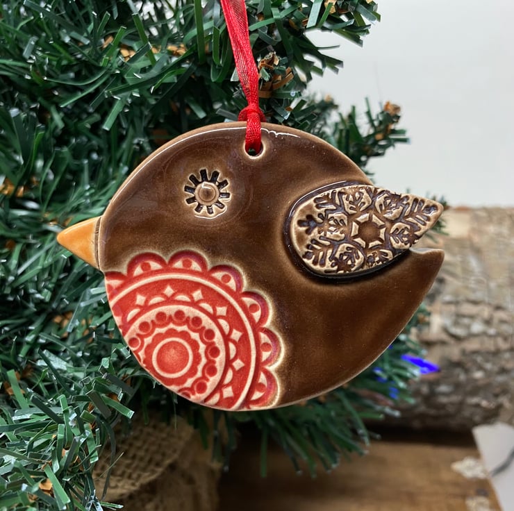 This cute little robin is made from white earthenware clay and decorated with pattern. It has been fired twice and finished with rich, glossy glazes. Glazed on the front only. It measures 8cm x 6cm x 0.7cm deep and hangs from a matching organza ribbon.